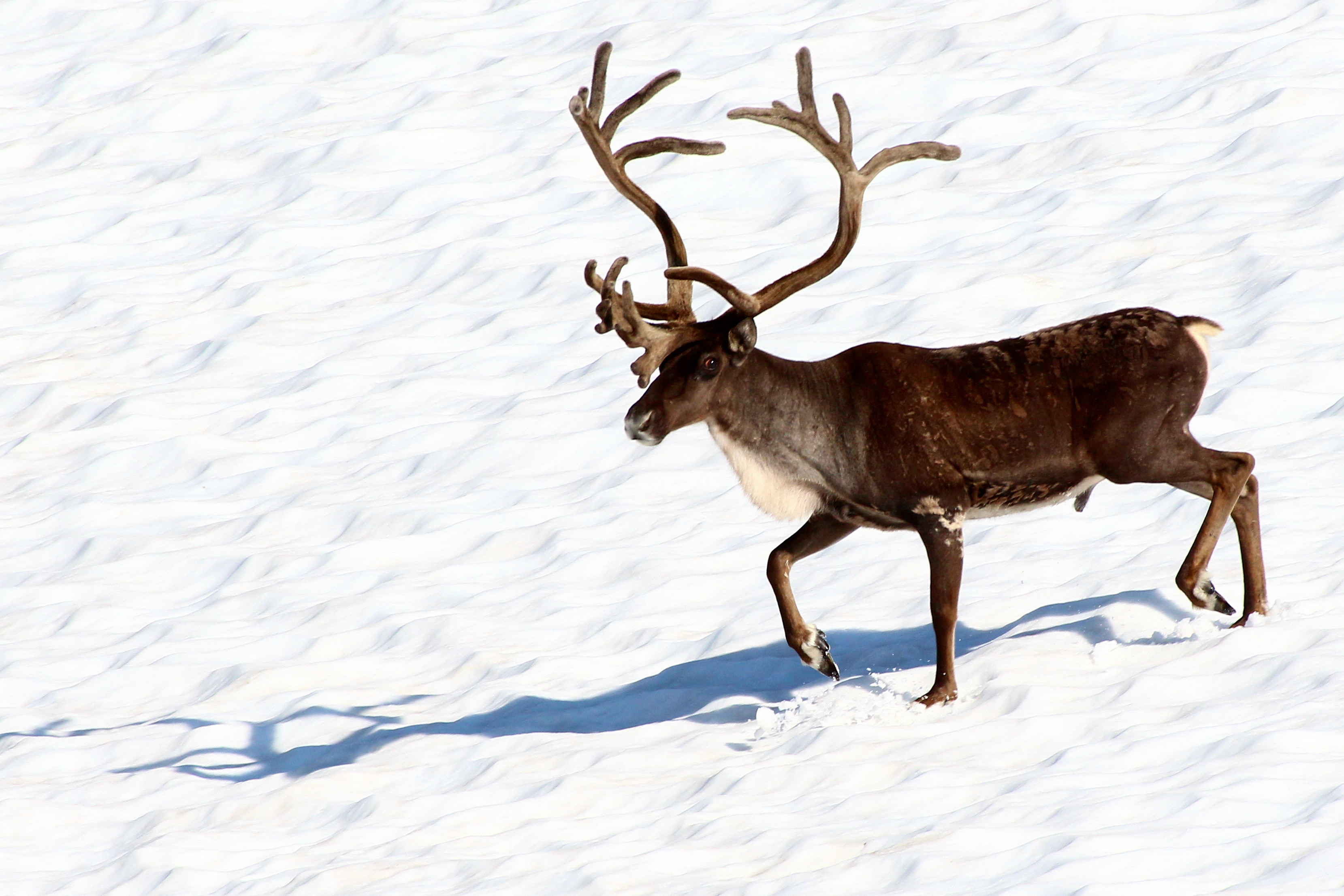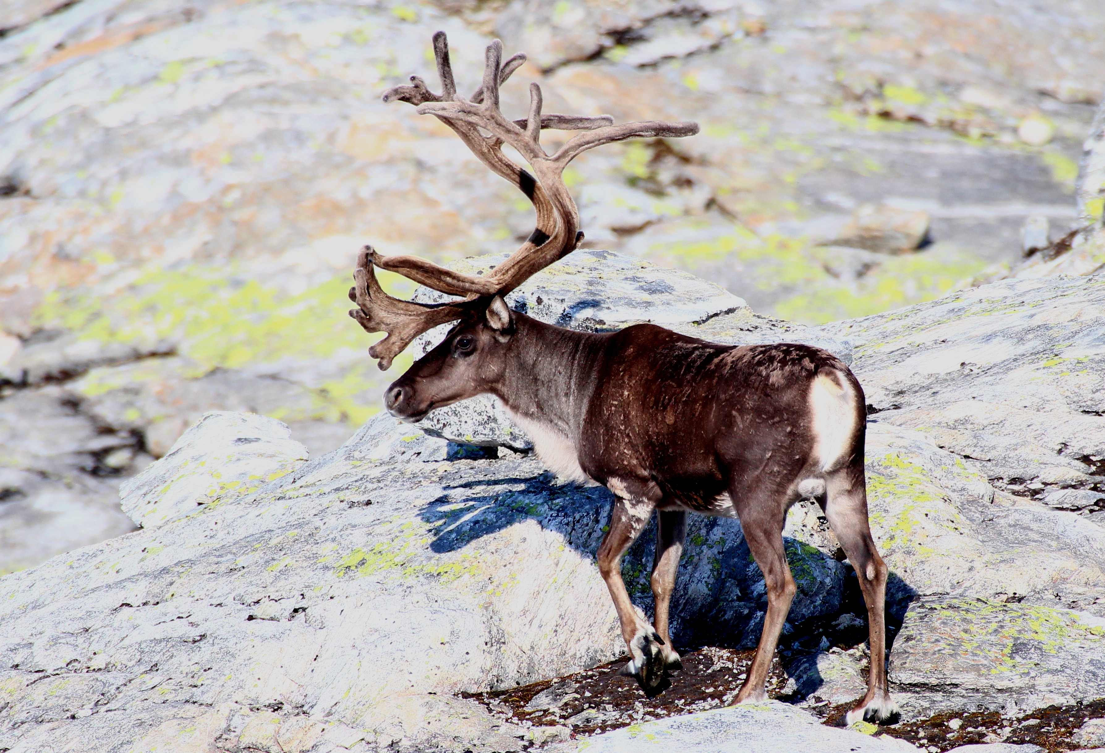 Villrein i høyfjellet over Blåbergdalen, mellom Røldal og Suldal, ca 1500 moh. Temperaturen er 20 C pluss selv her i høyden, og reinen søker lindring fra varme og insekter her i snøen og til dels stående inn under en skavl. Foto fra en tur til Knoda 23/7.