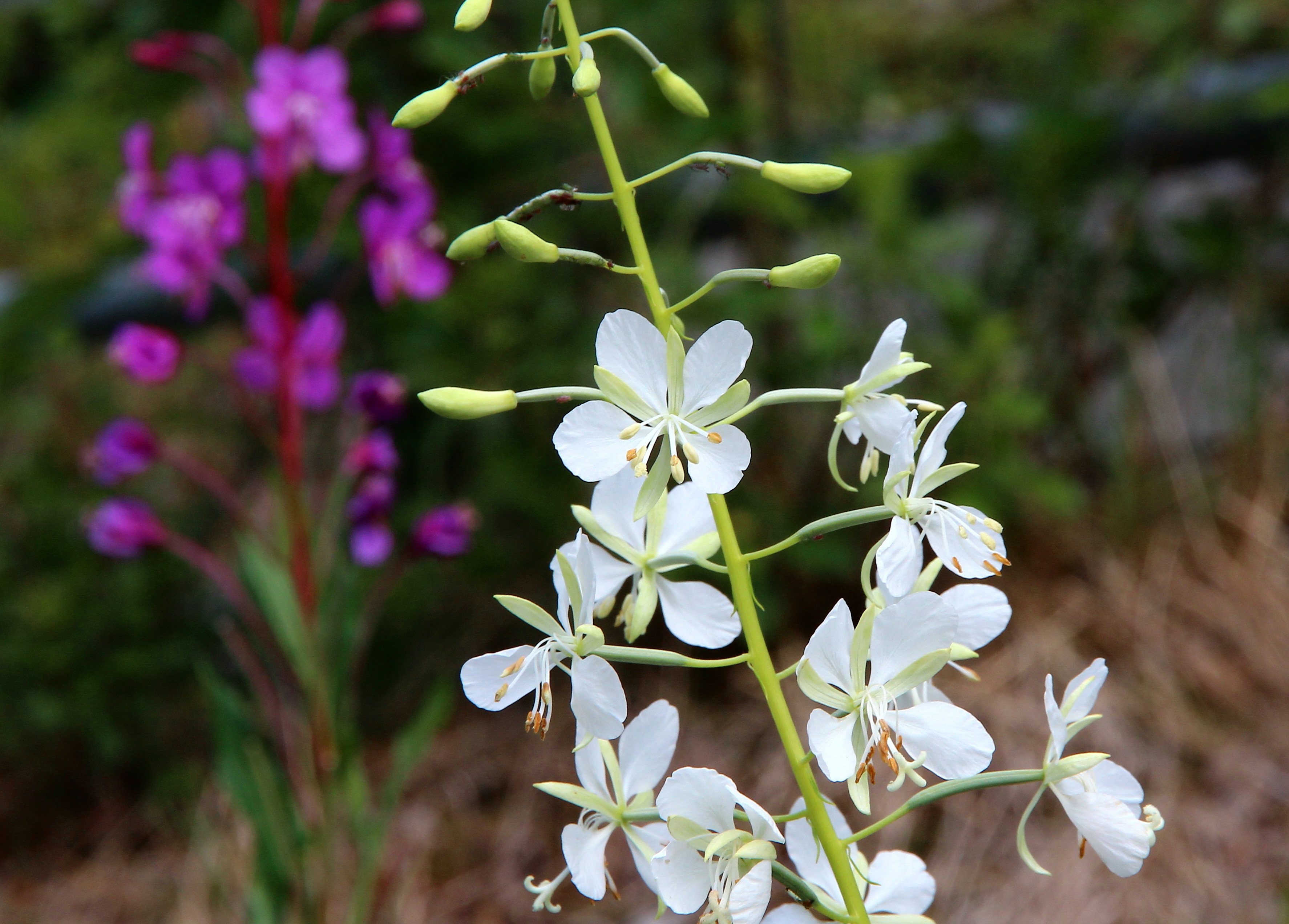Ett eksempel: Hvit geitrams (Chamerion angustifolium), fotografert medio juli nær Edland. Flere eksempler er bl.a. revebjelle og engfiol, se https://rexyz.me/andre-fotos/planter/