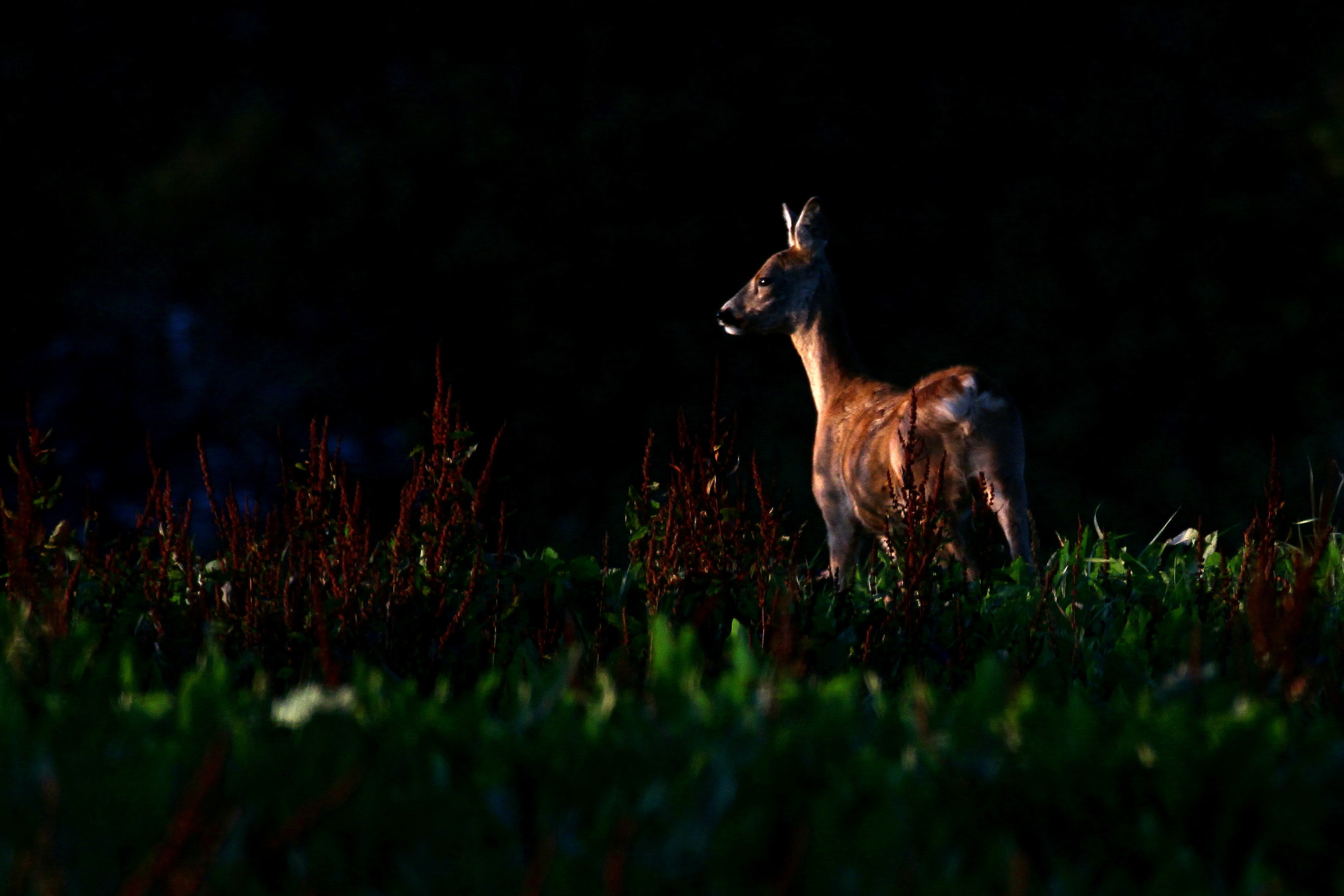 Rådyr fotografert i Kvalamarka, der det rolig beiter (sammen med kalven, utenom bildet) i skinnet fra kveldens siste sollys 28/8.