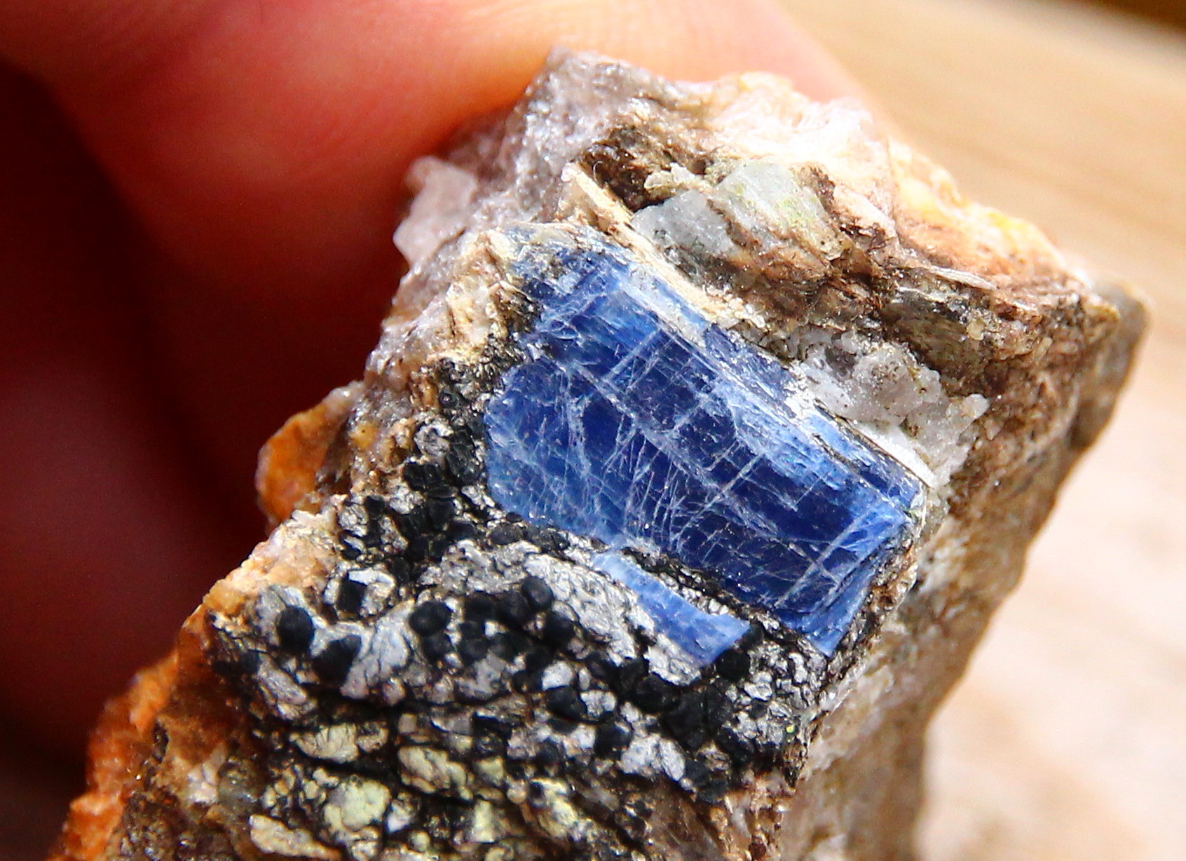 kan oppvise en fin dyp blåfarge, som i dette bruddstykket av en kyanitt-krystall,
