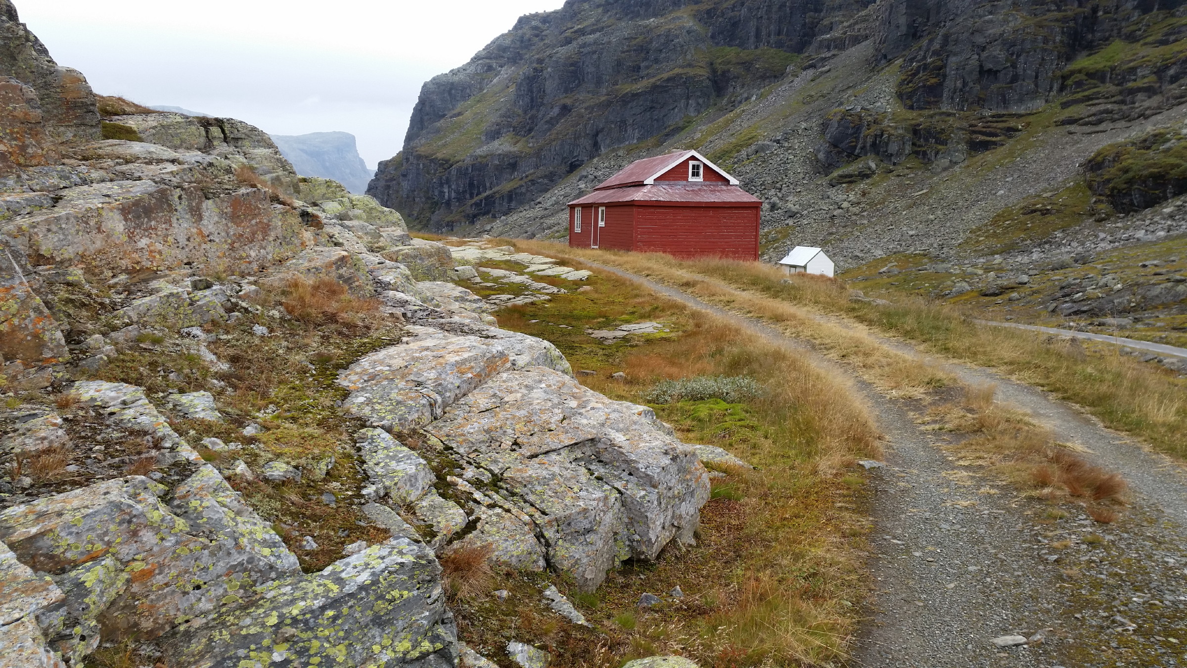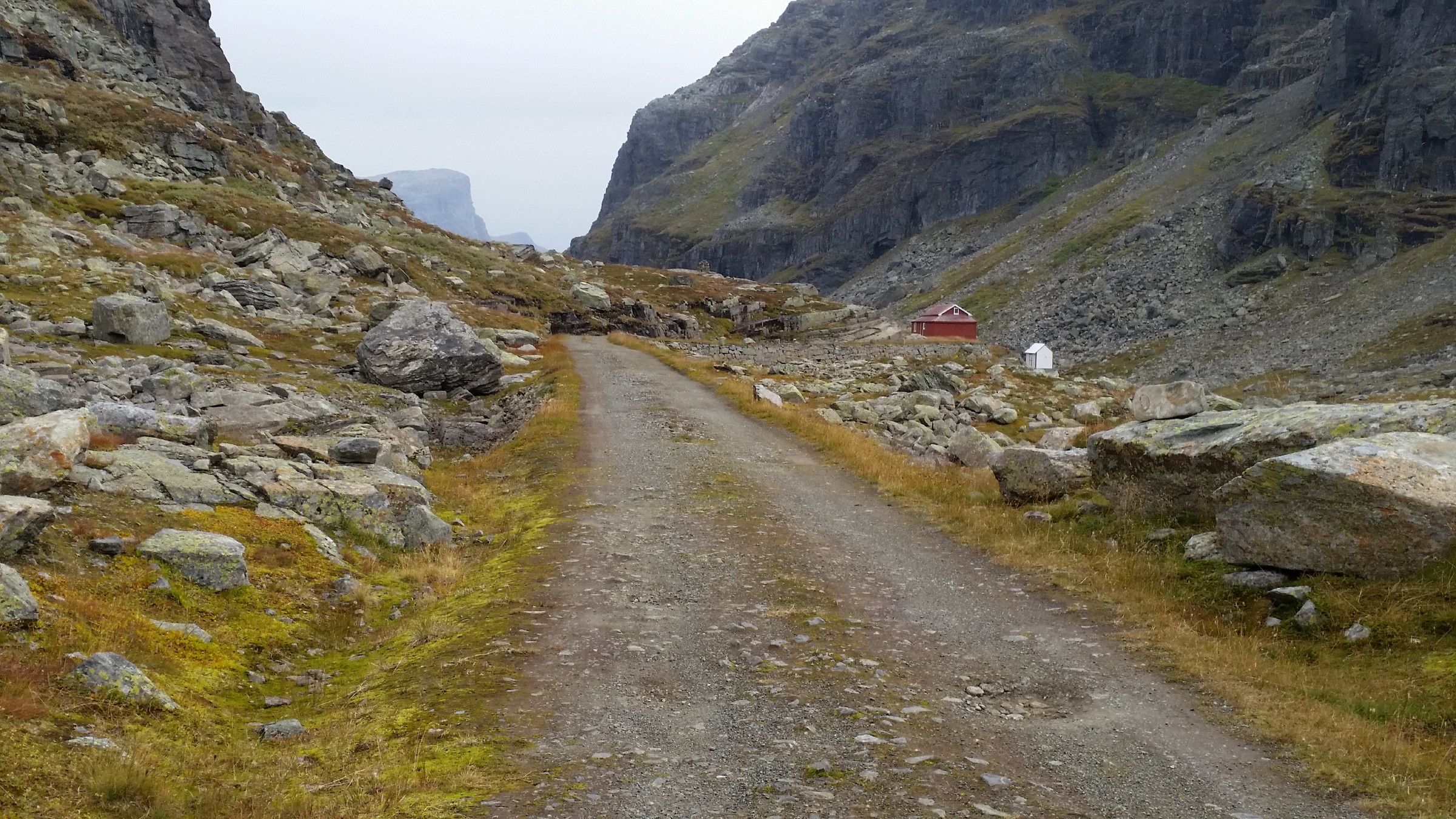 under er ”nye gamlevegen” sett mot øst – «nyevegen» (E134) går i tunnel like under (luftetårn ca. midt i bildet) – til høyre i forgrunnen er fjellet Sveigen, i bakgrunnen Storenup, og i venstre billedkant litt av Verjesteinsnuten