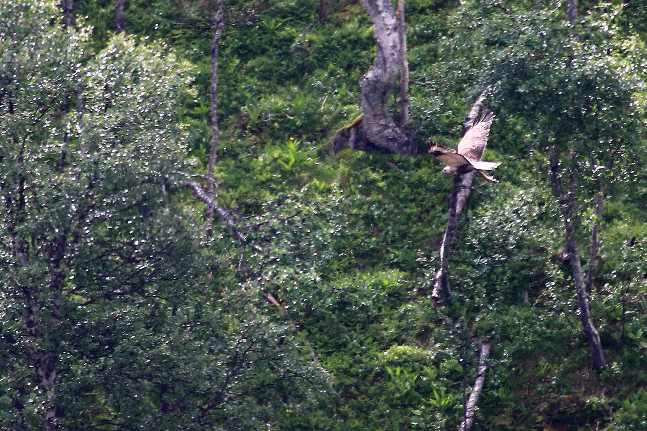Selv om dette er en langt vanligere fugl i fjellheimen, er bildene likevel interessante nok da de avslører at rovfuglen bærer med seg et byttedyr dinglende i klørne, mest sannsynlig en røyskatt.