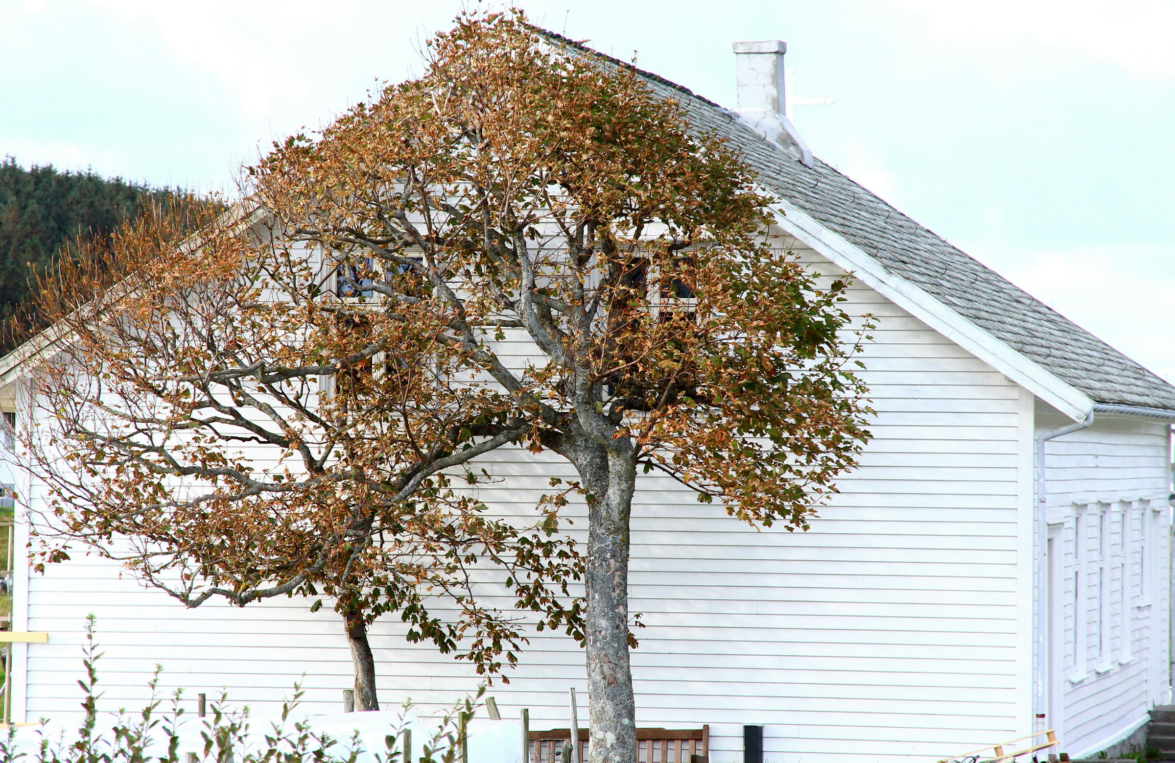 hvor naturen påvirker bygg – og bygg former naturen (trær i le av sørveggen på bedehuset)