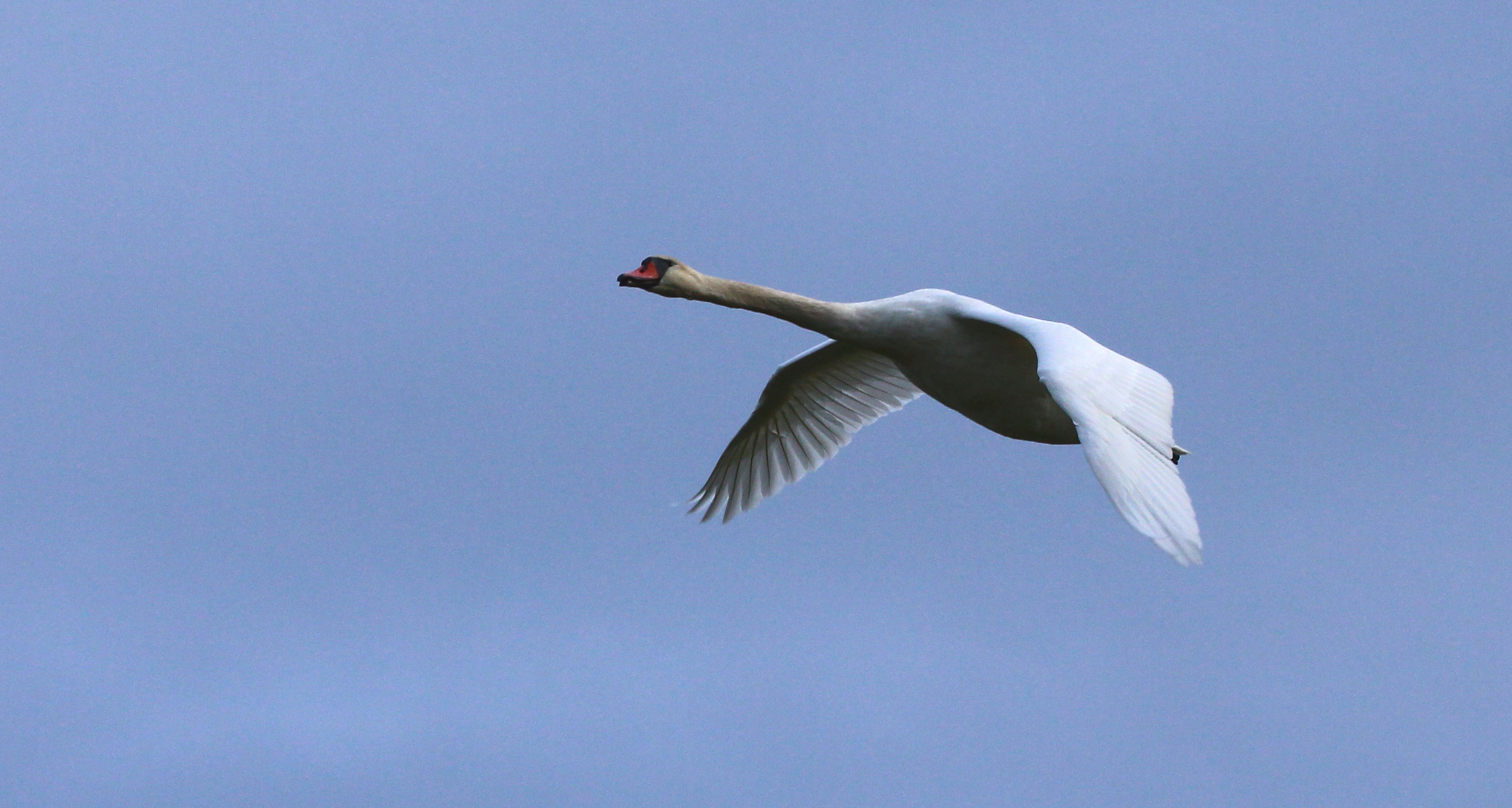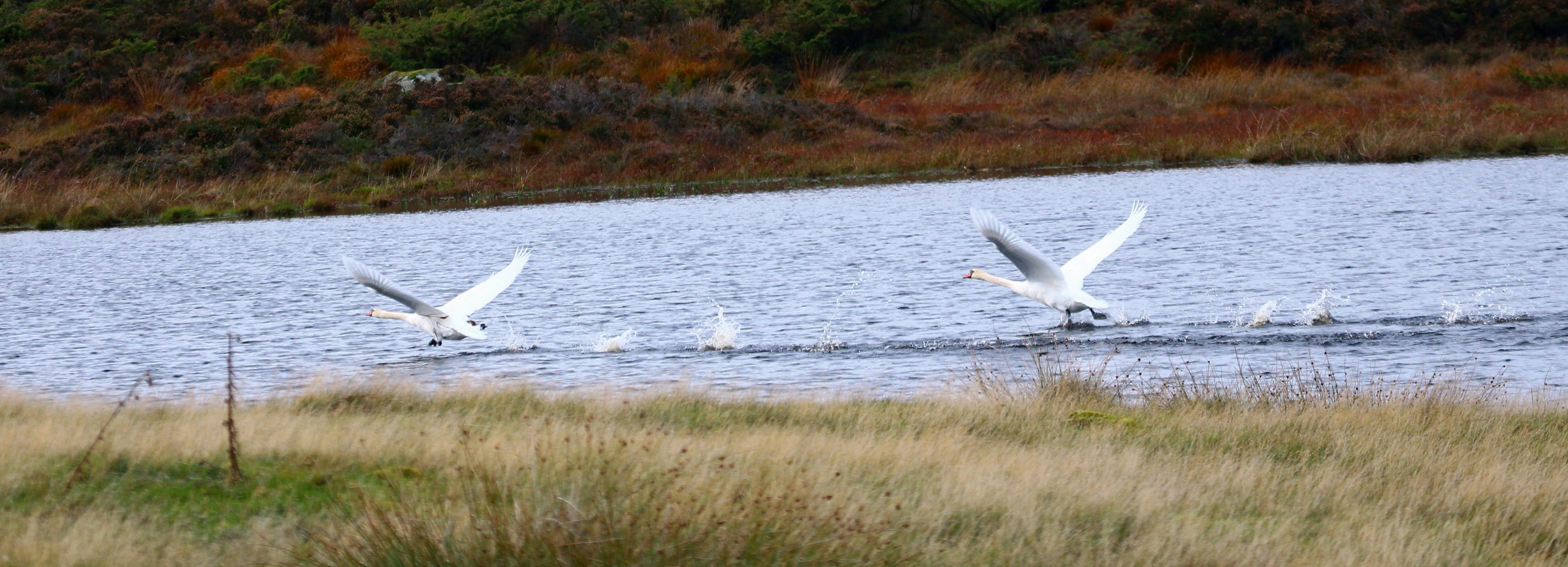 Knoppsvaner, fotografert under flygeøvelser ved et lite vann på Hillesland, Karmøy i oktober