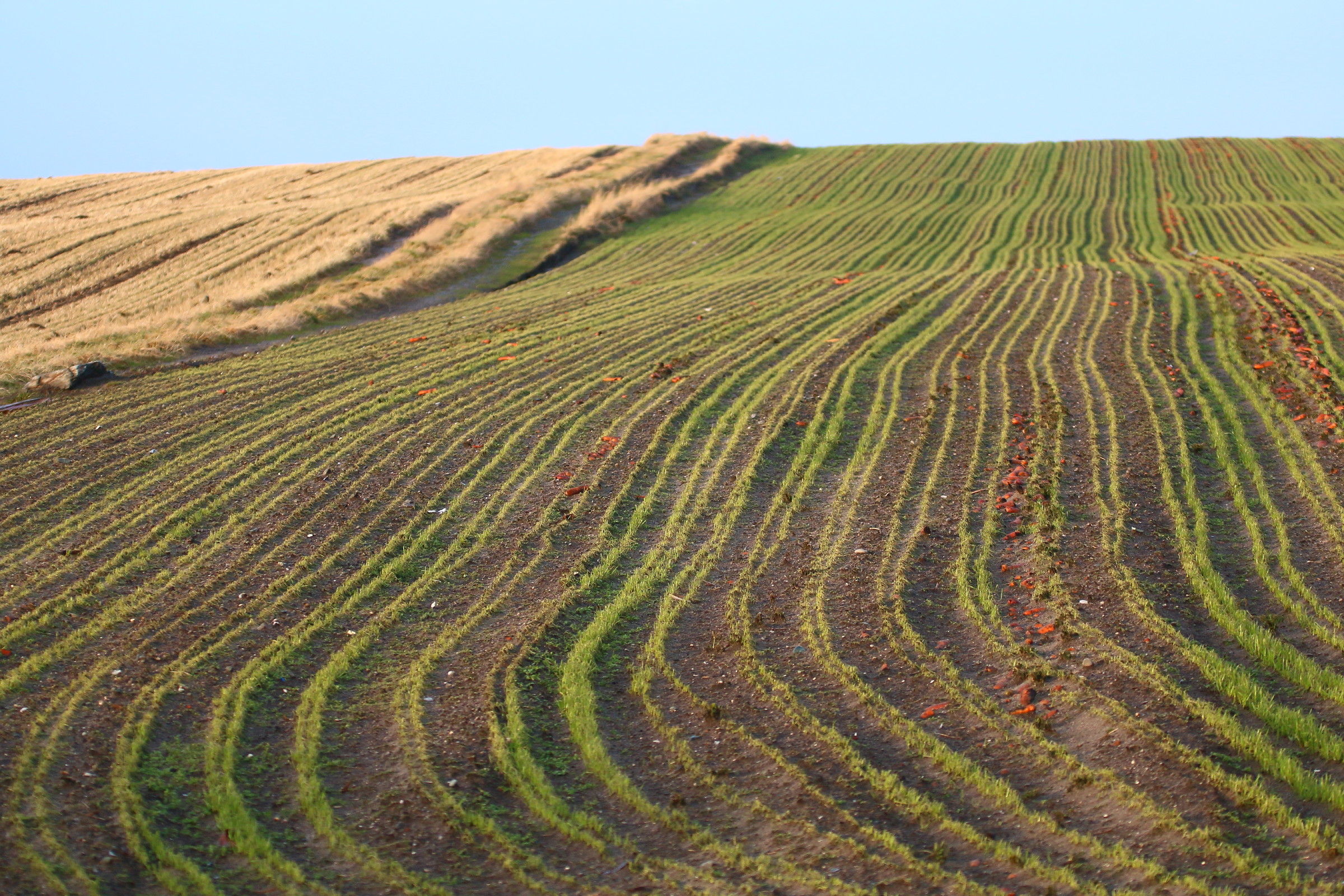 i en desember-åker ellers nysådd og nyspirt, fotografert i solnedgangen