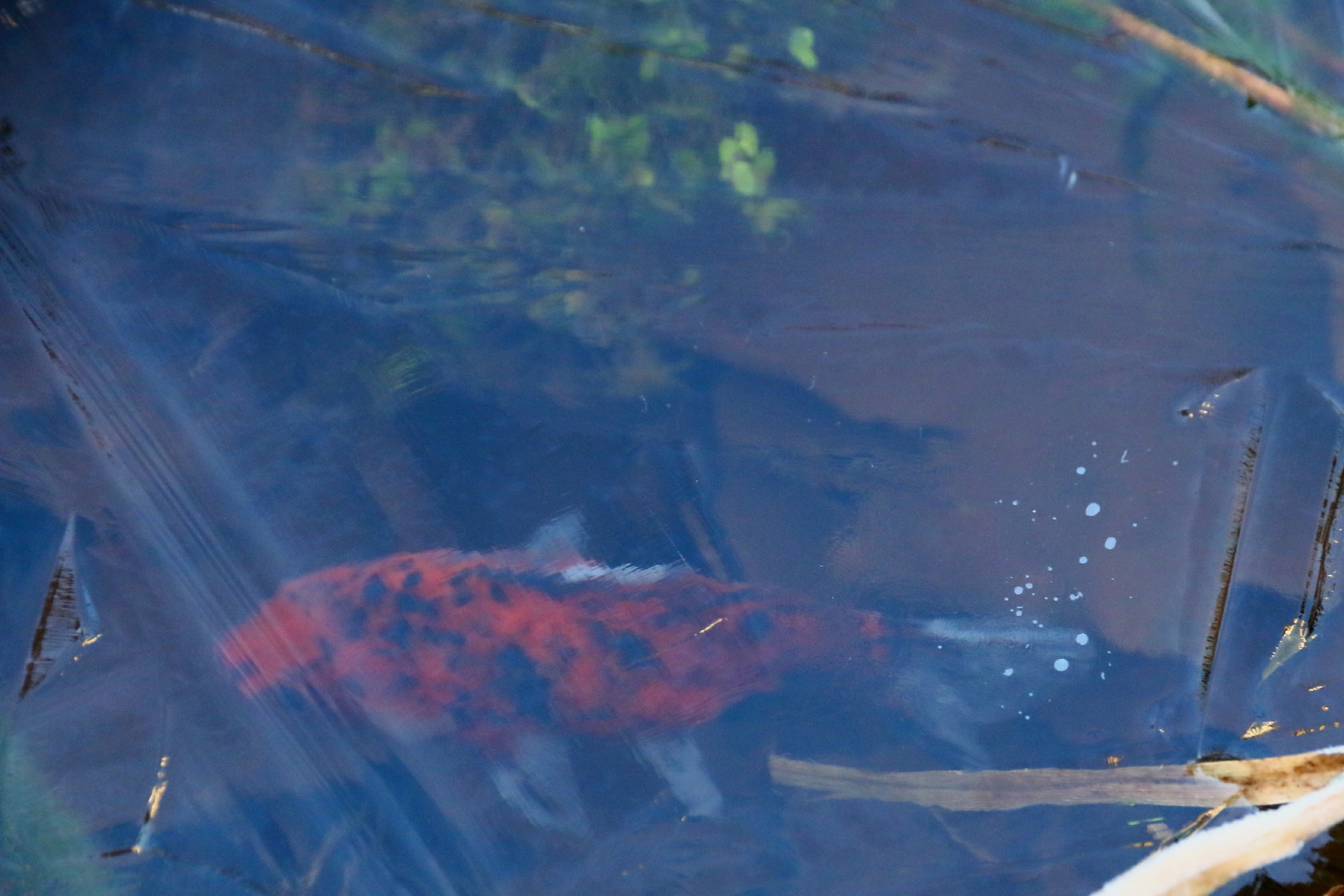 «Gullfisk» (av type koi) i hagedammen – sammen med plantene kjerringrokk og andemat