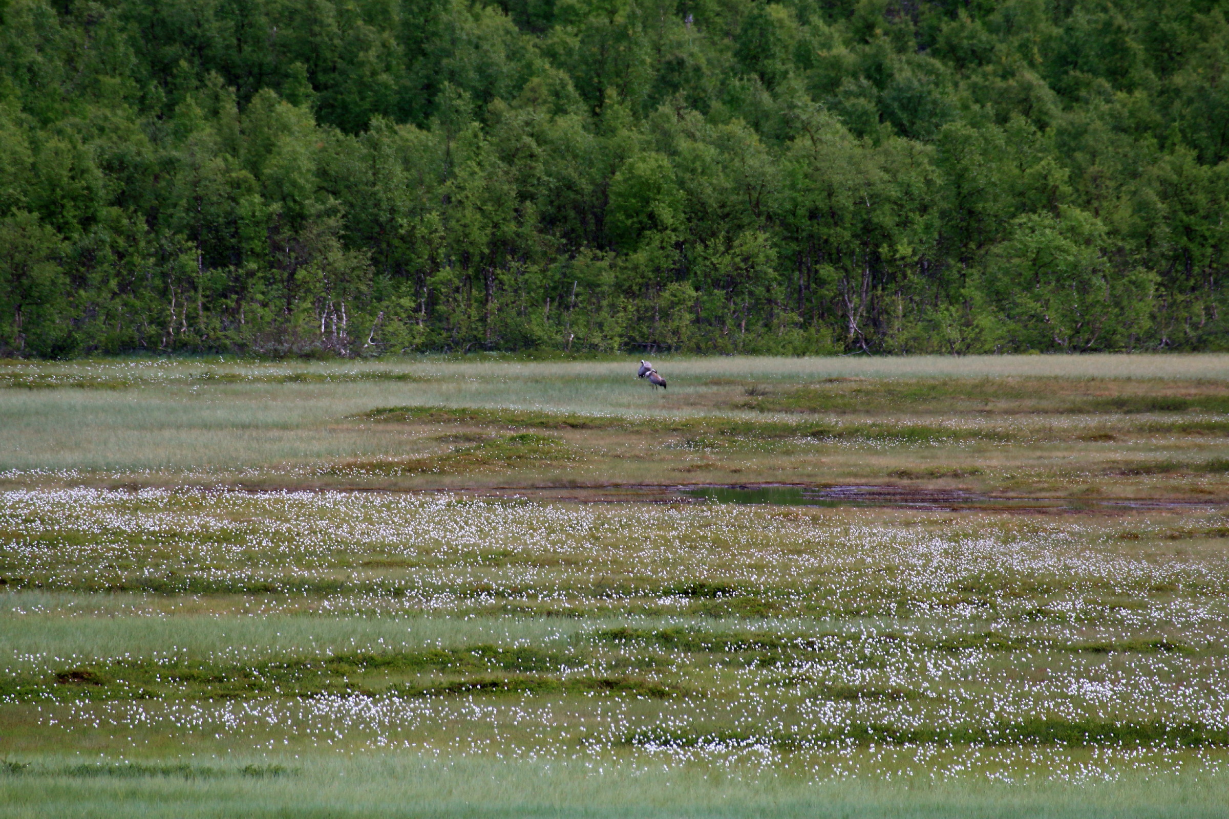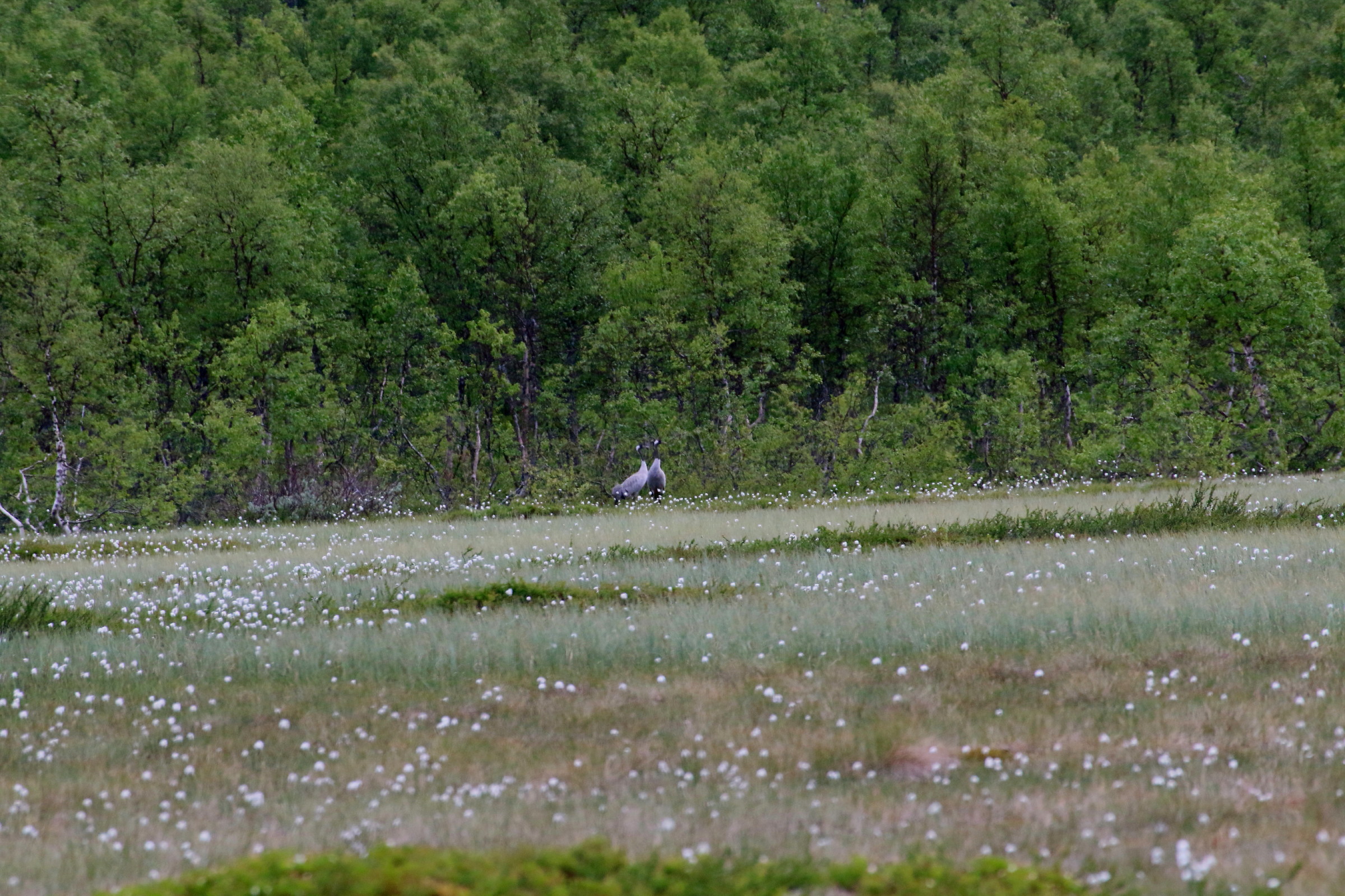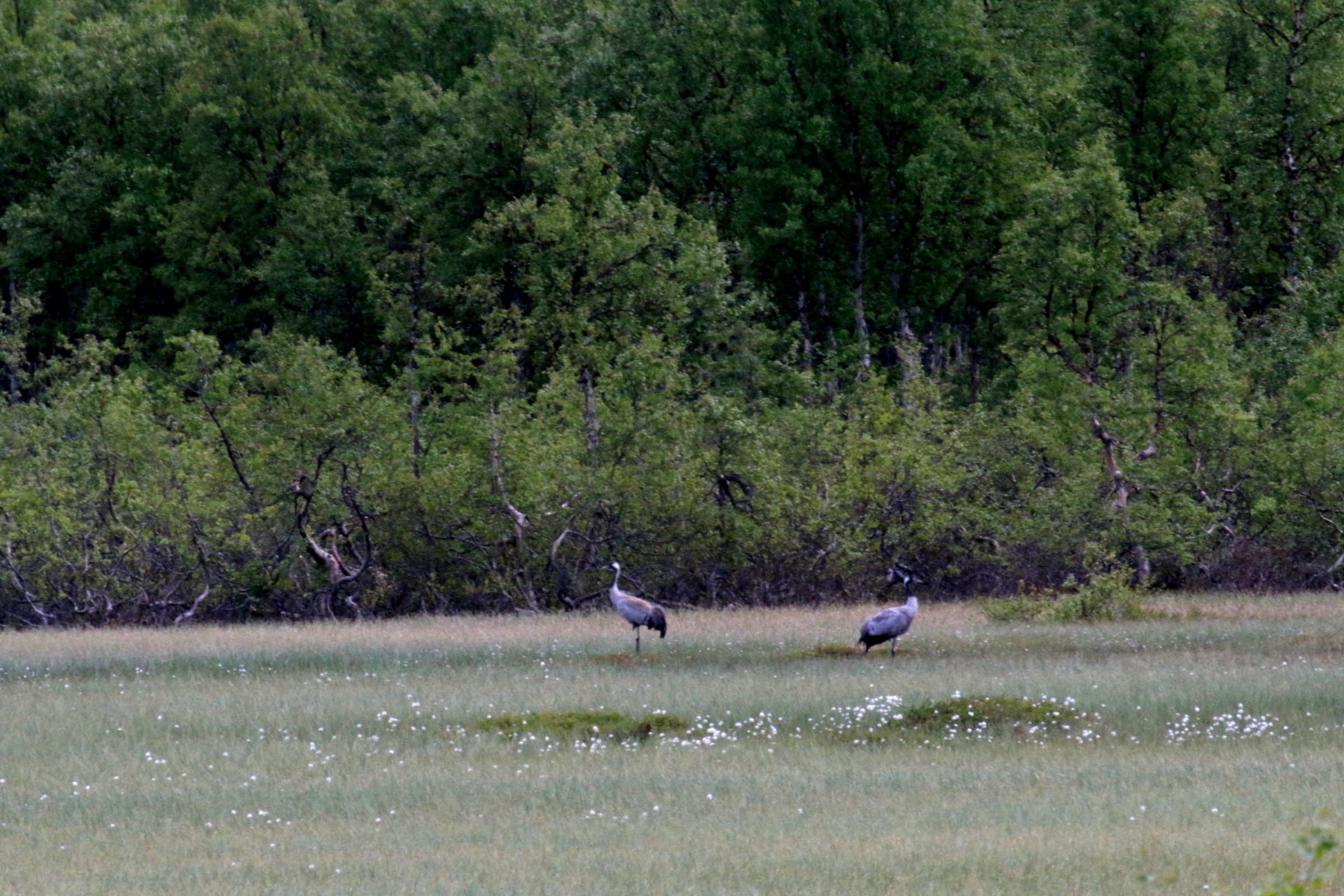 Dette første bildet er tatt på kanskje en kilometers avstand, etter at min turkompis hadde spottet dem gjennom 600 mm’en sin. Godt gjort ! Bildet viser omtrent hva vi så med øyet, to små prikker, midt på myra nærmest skogkanten (brennvidde 100 mm, ucroppet)