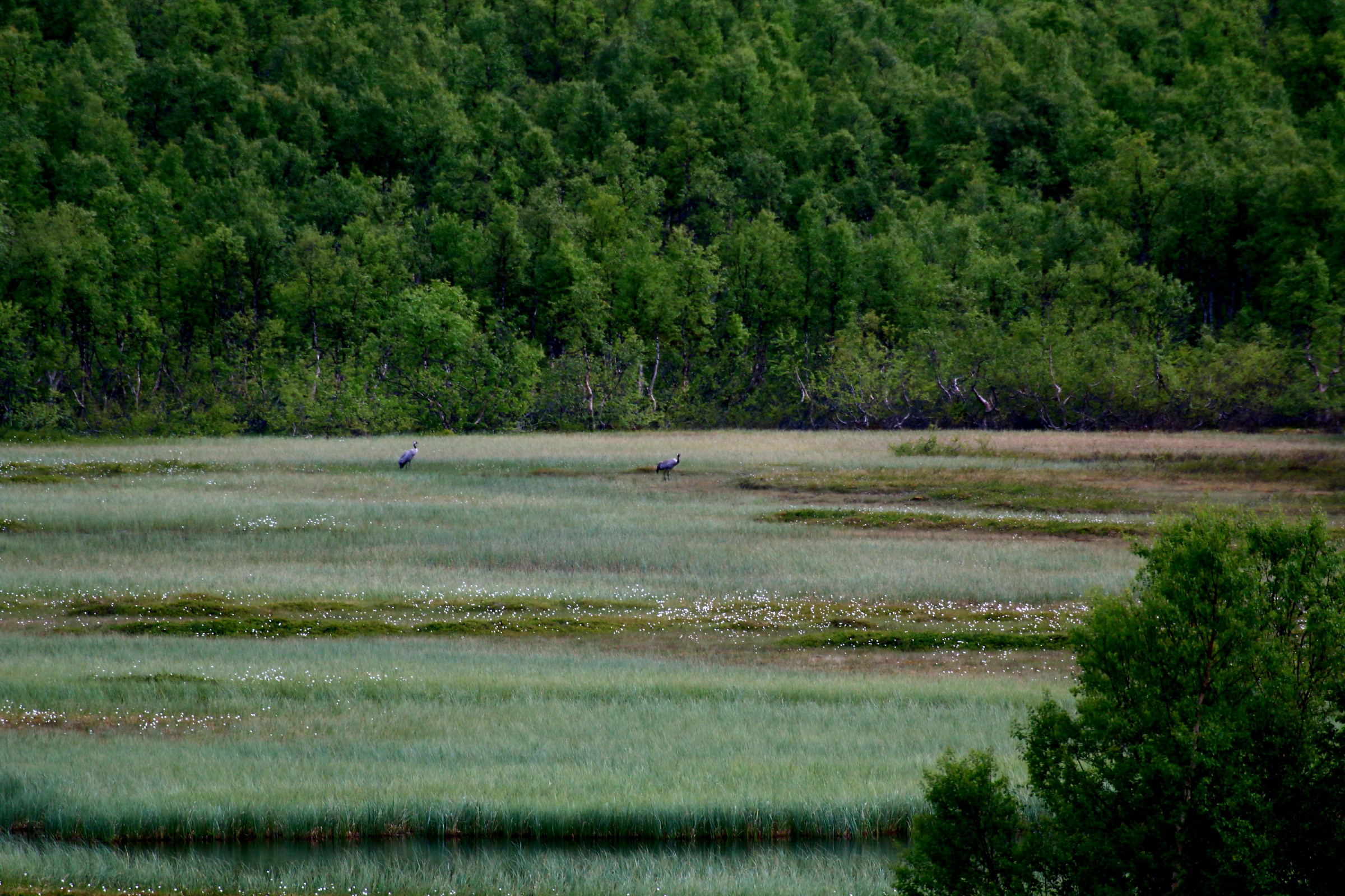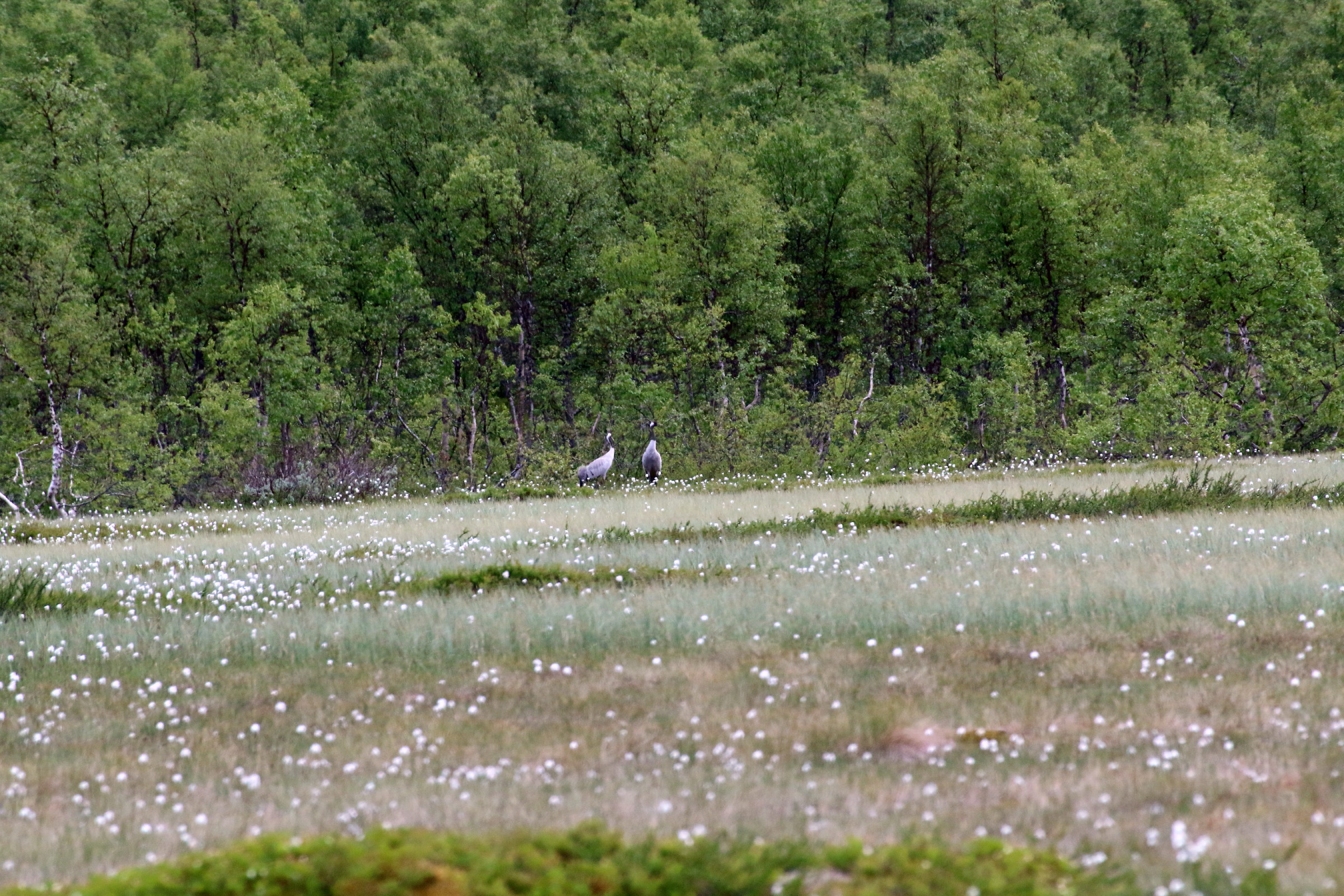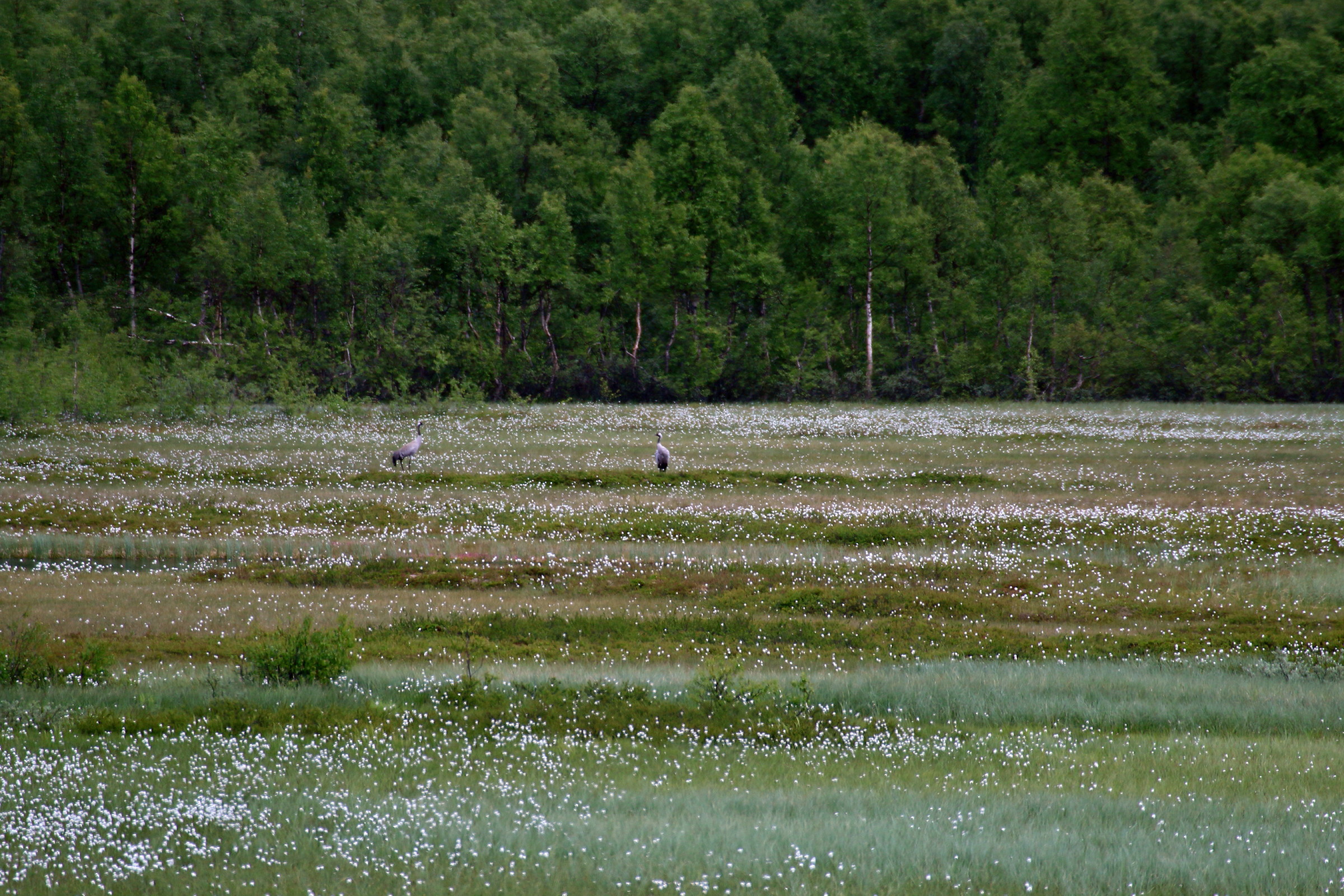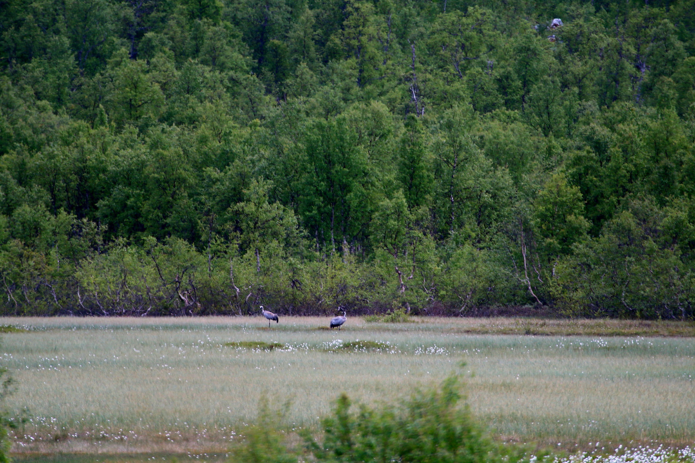 Dette første bildet er tatt på kanskje en kilometers avstand, etter at min turkompis hadde spottet dem gjennom 600 mm’en sin. Godt gjort ! Bildet viser omtrent hva vi så med øyet, to små prikker, midt på myra nærmest skogkanten (brennvidde 100 mm, ucroppet)