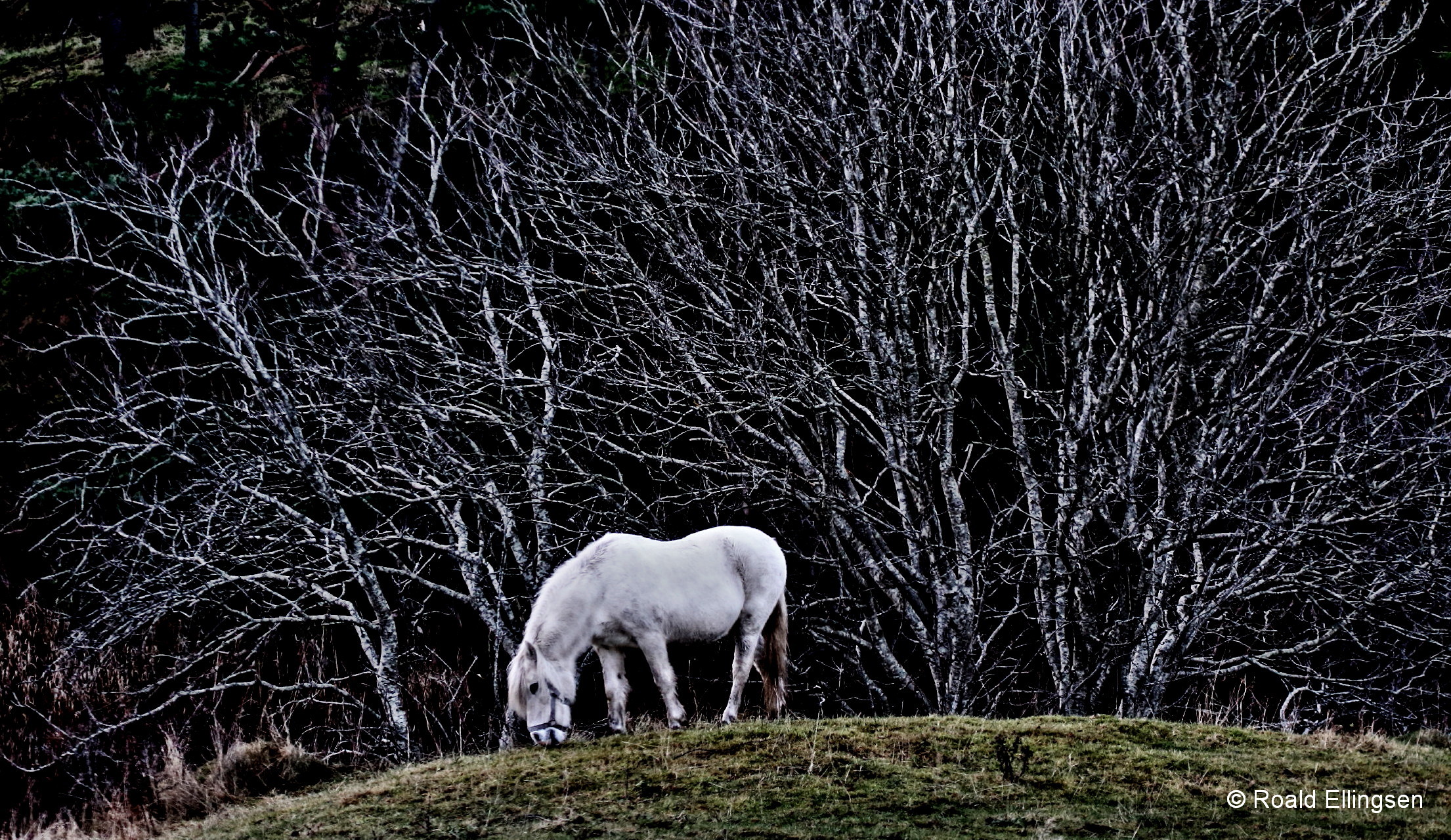 Hesten – nydelig plassert på jordet, bakgrunnen dråpetunge oretrær mot sort vann.