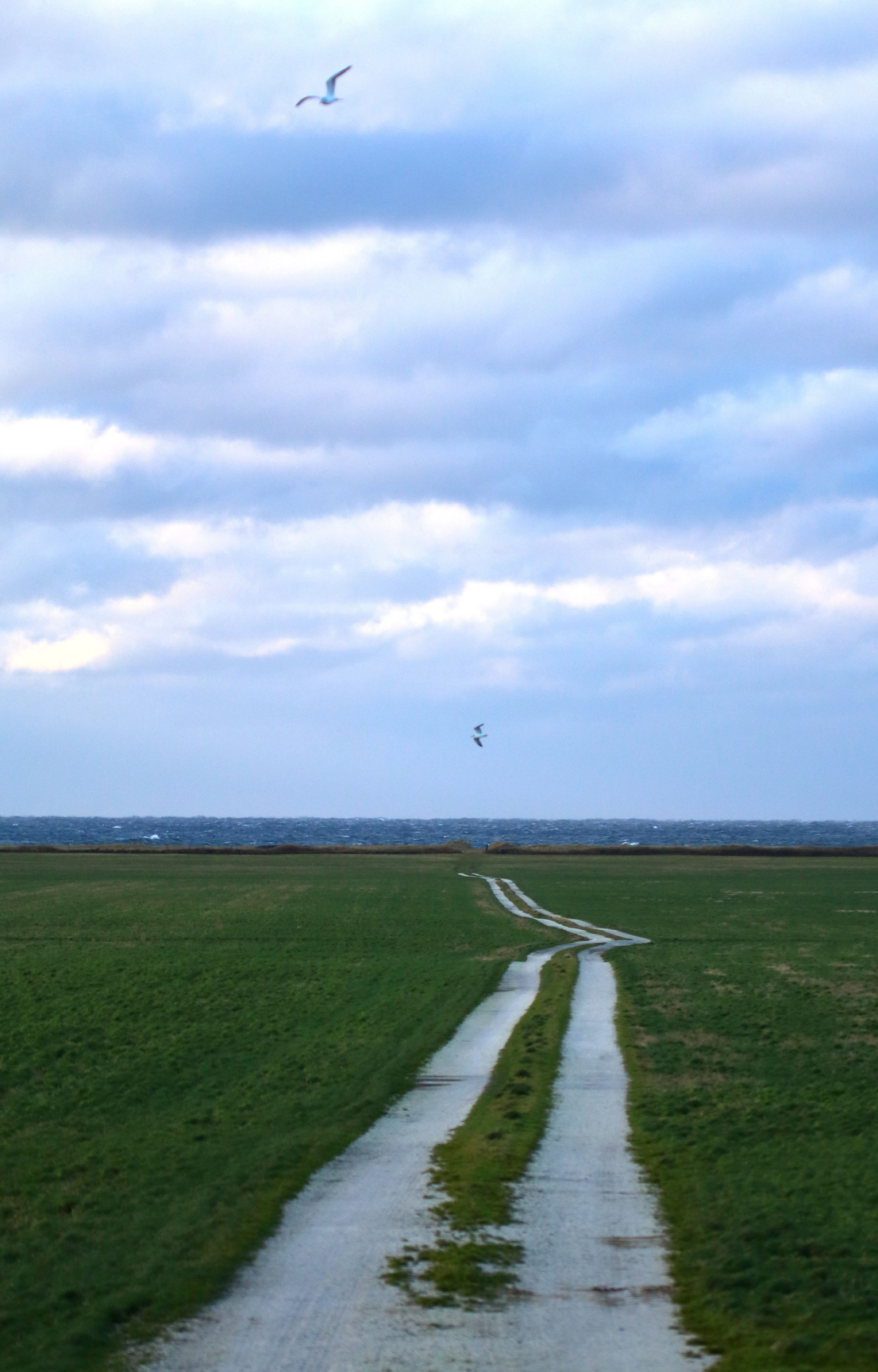 vintergrønne jorder – en traktorvei av hardpakket strandsand bølger seg mot havet