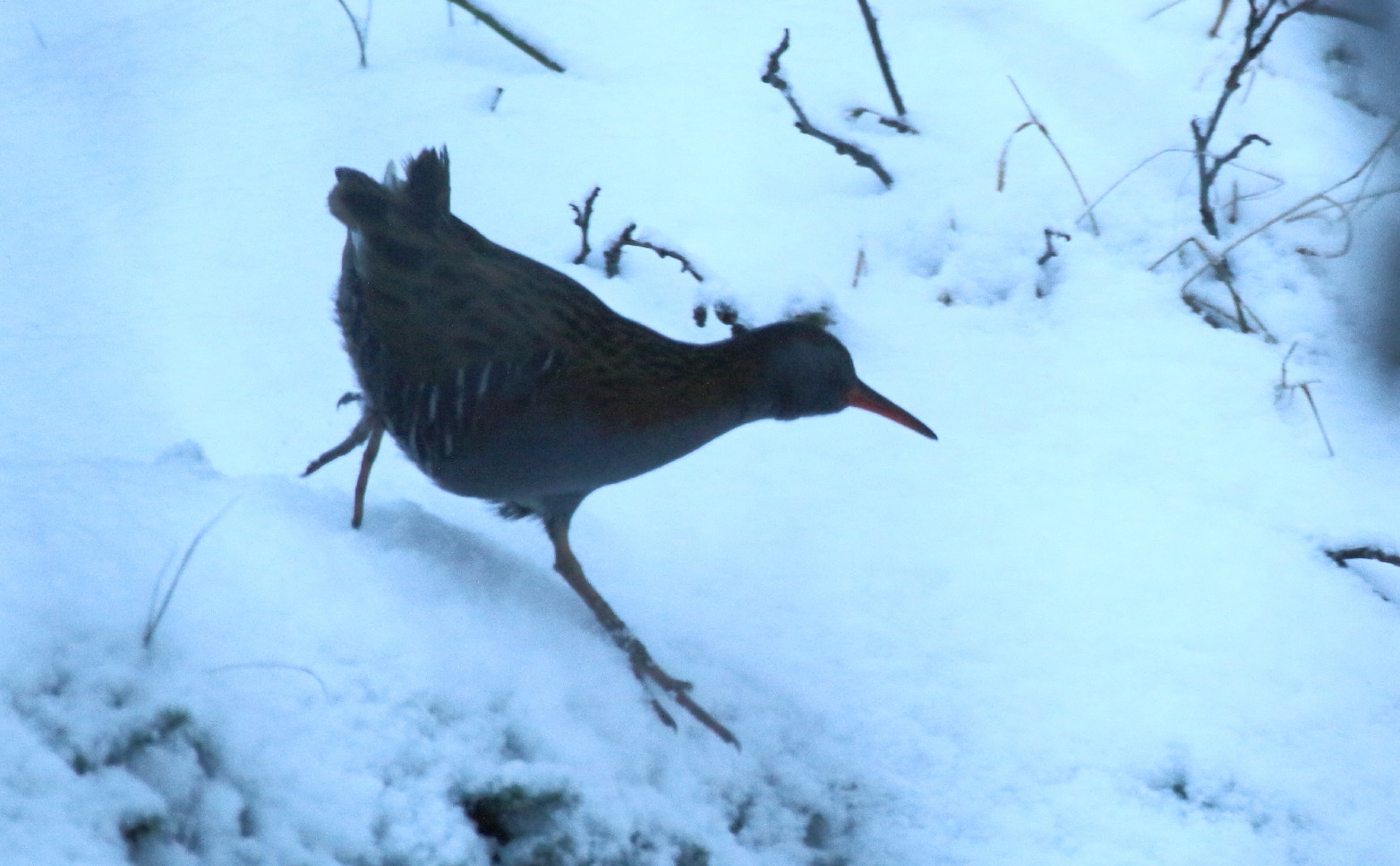 Vannrikse (Rallus aquaticus) – fotografert midtveis januar like ved Arkavatnet i Haugesund, hvor bekken mot Røyrvatn / Skeisvatn i kuldeperioder har isfrie partier.