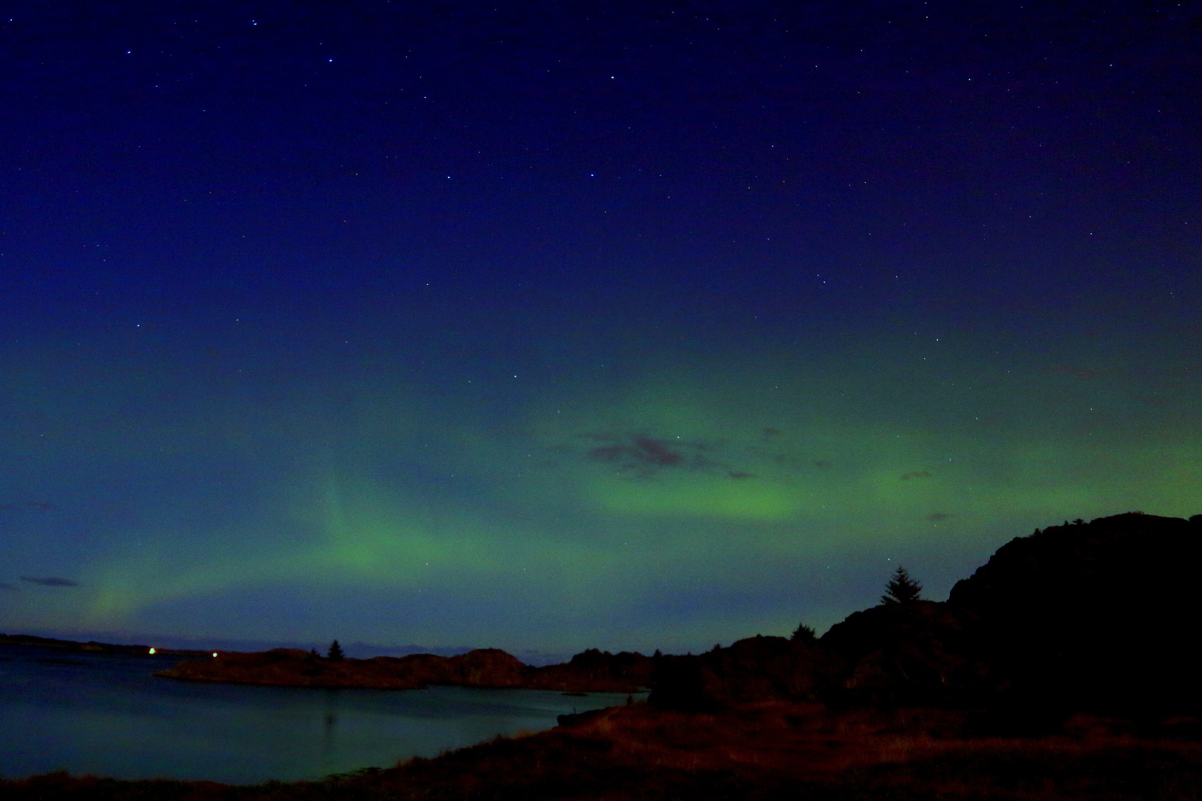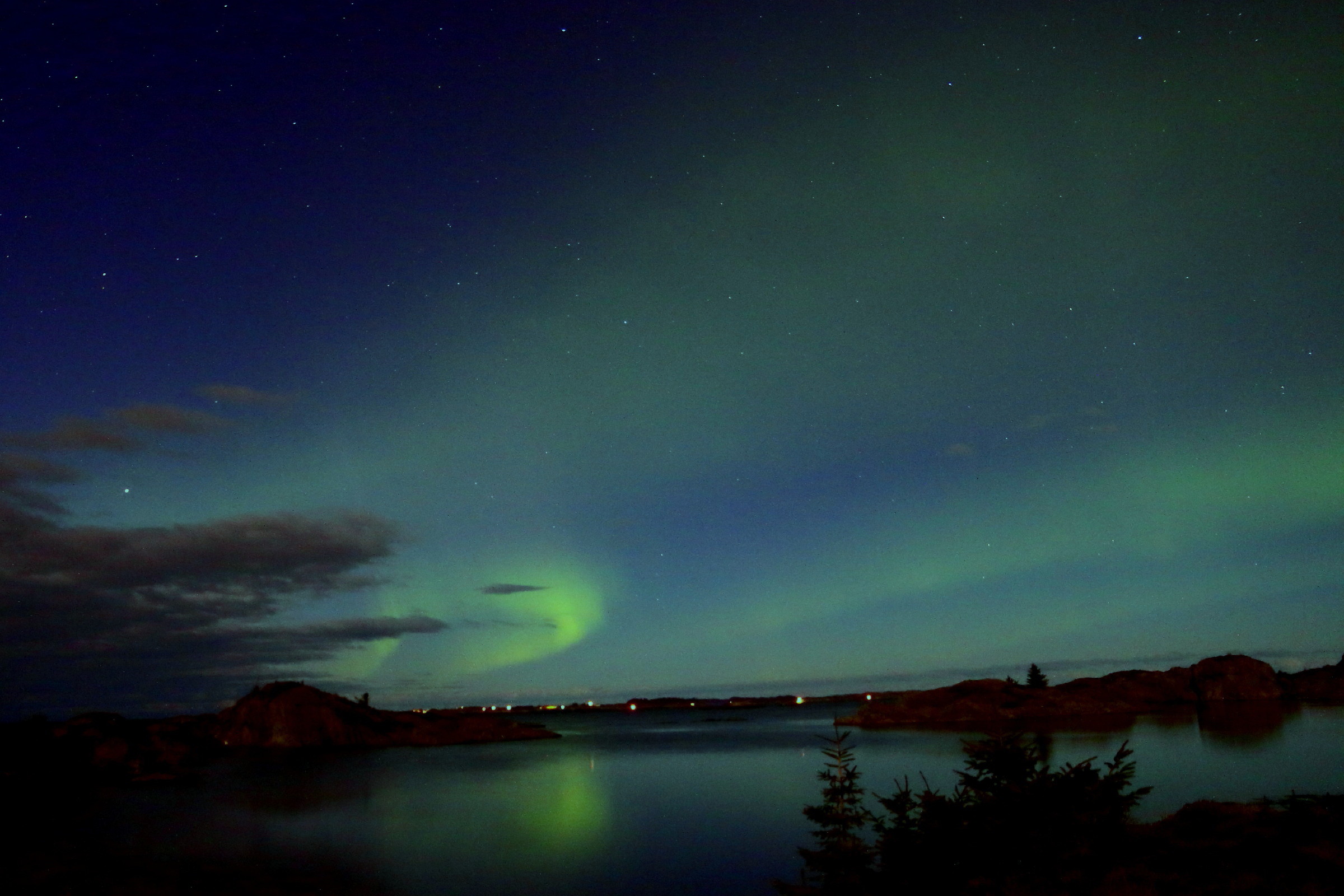 kjører ut litt før kl 21, og på vei ut det siste stykket til fots i mørket ser det faktisk veldig lovende ut – observerer både ‘strålebunter’ og ‘gardiner’ over skogen der jeg går rundt den for å få fri utsikt mot nord, med sjø i mellom med muligheten for speiling på vannet
