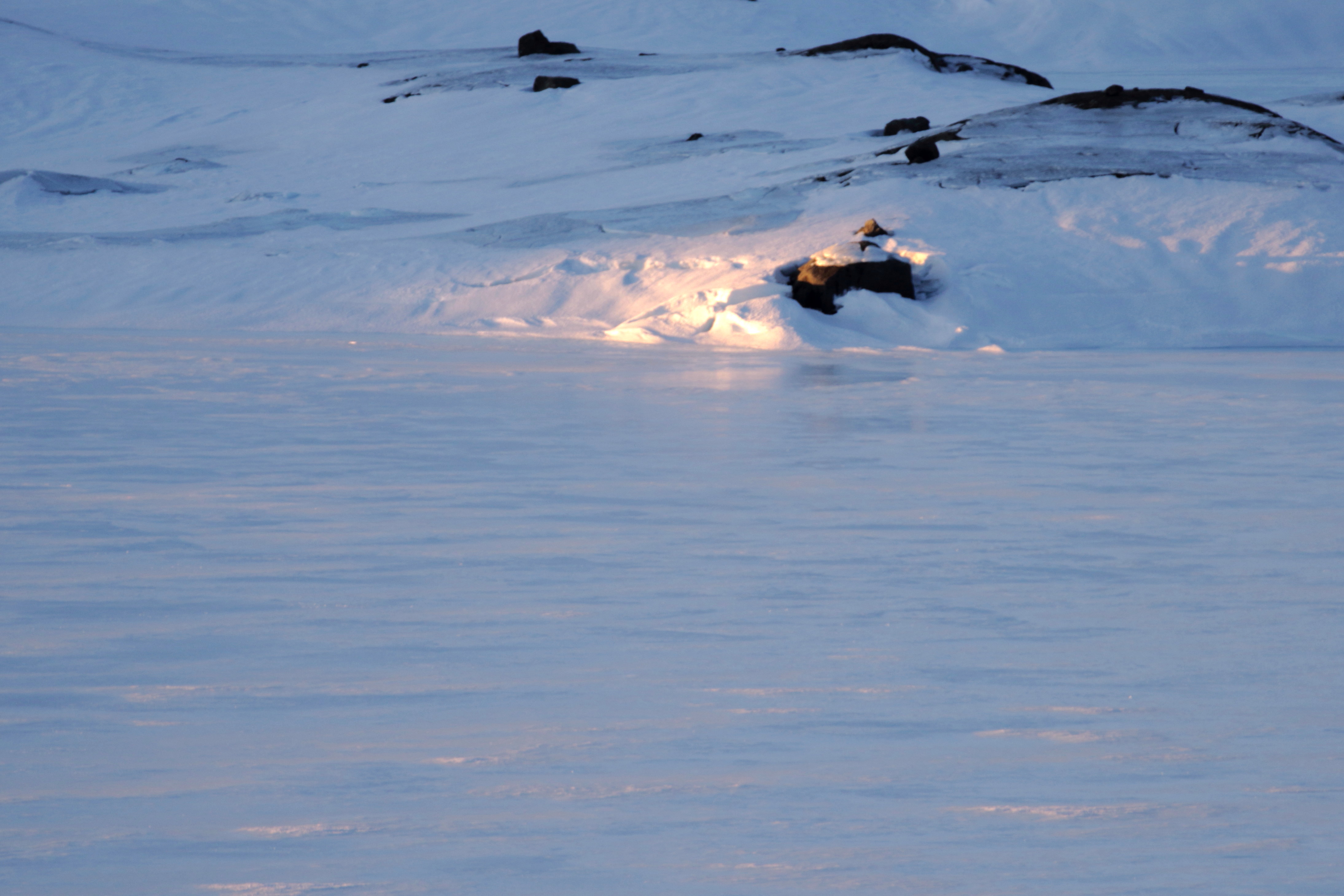 De siste strålene fra en lav kveldssol bader snølandskapet i varme farger