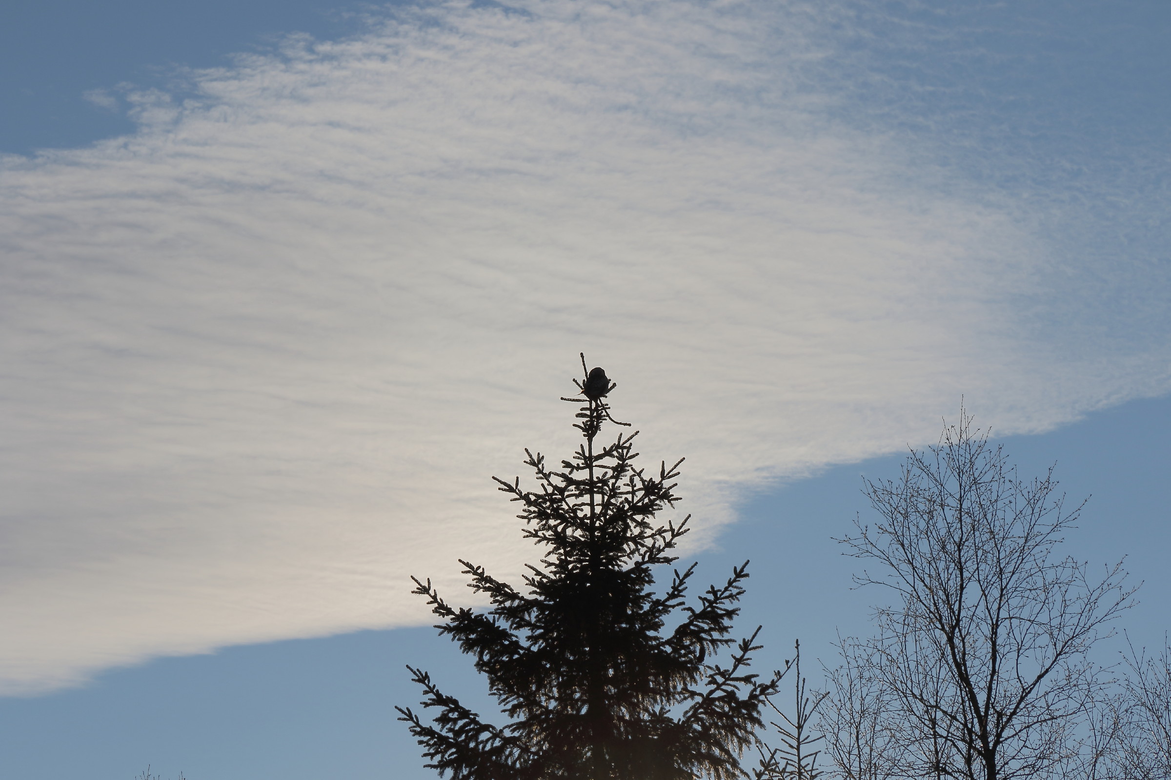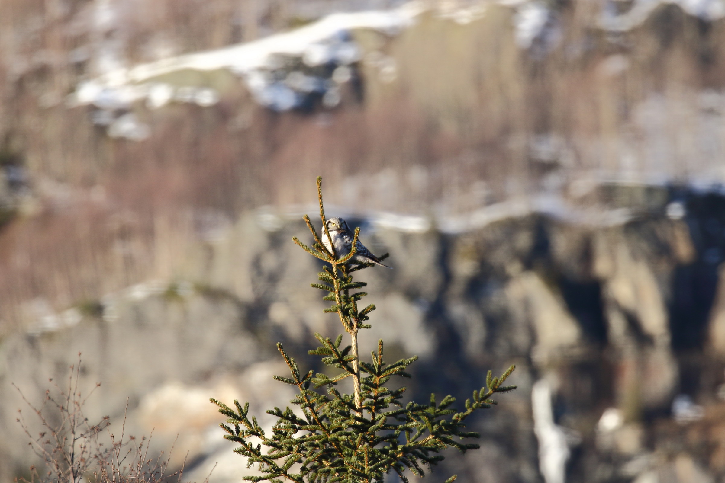 Men på tilbaketuren i går, like før sola dalte bak fjellene, ser jeg med ett silhuetten i grantoppen.