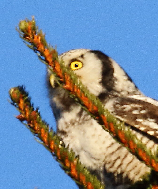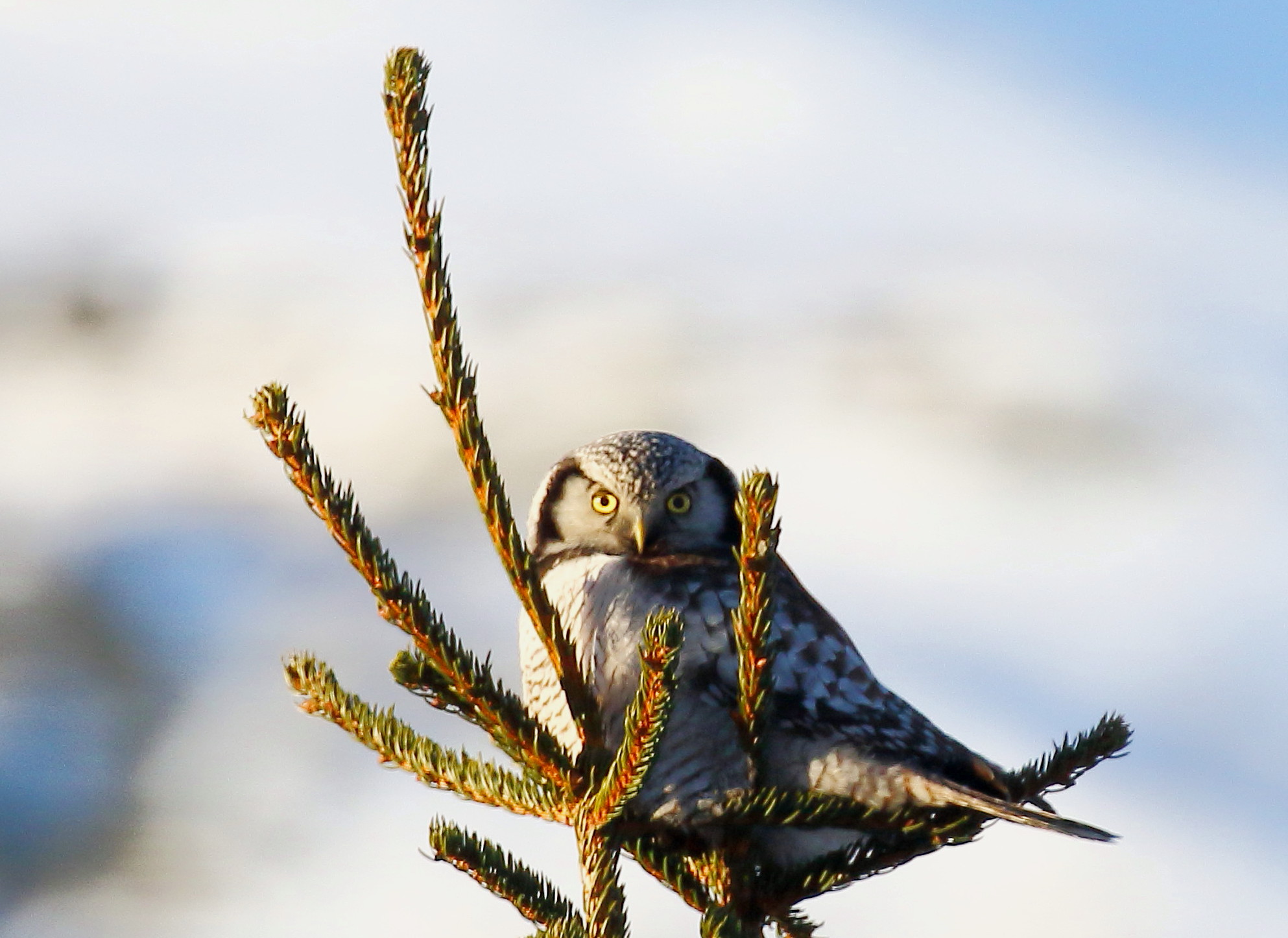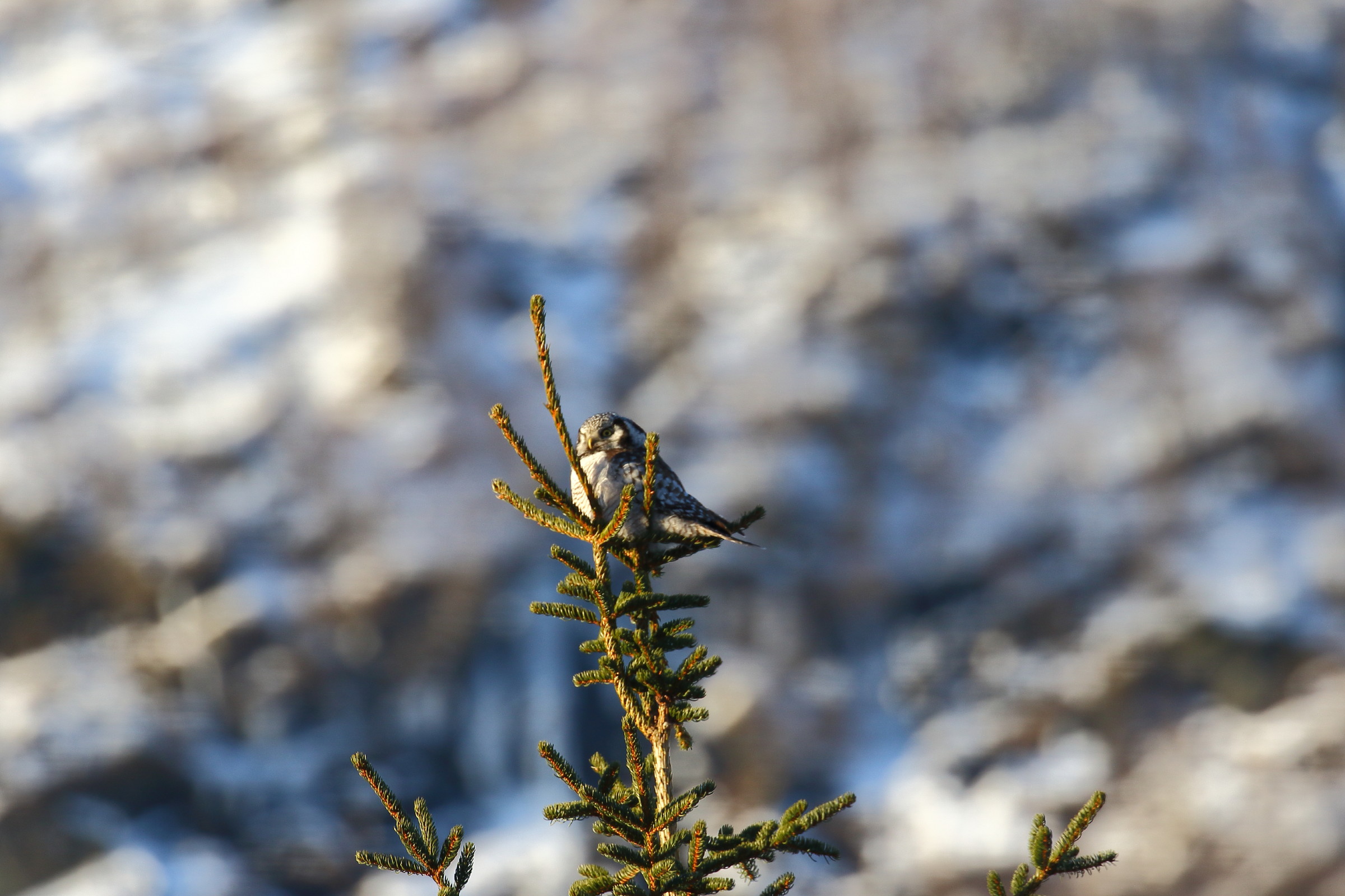 Haukugla sitter der fortsatt, delvis gjemt bak grankvistene i toppen av treet. Sniker meg rundt, gjennom tett underskog for å få bilder fra en annen vinkel. Vasser i 30 cm hardfrossen snø, som gir masse lyd der jeg beveger meg mellom trærne. Kommer meg under treet der ugla sitter, tidsnok til å se den sleppe seg lydløst ut i lufta og forsvinne i en bue over de lavere bjørkene. Litt skuffet vasser jeg samme vei tilbake gjennom snøen.