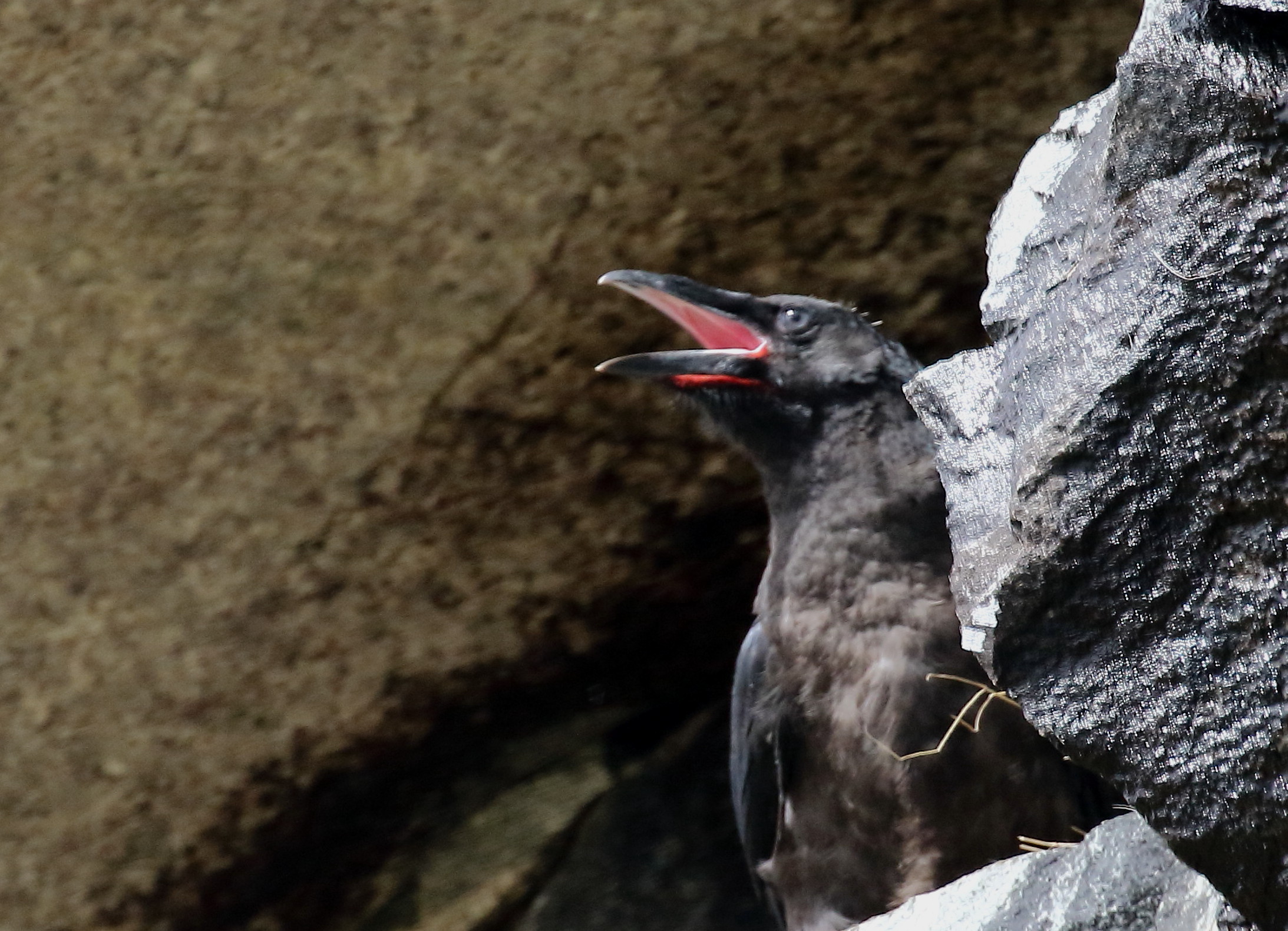 sitter der på fjellhylla like ved reiret, åpner gapet og følger intenst stirrende en