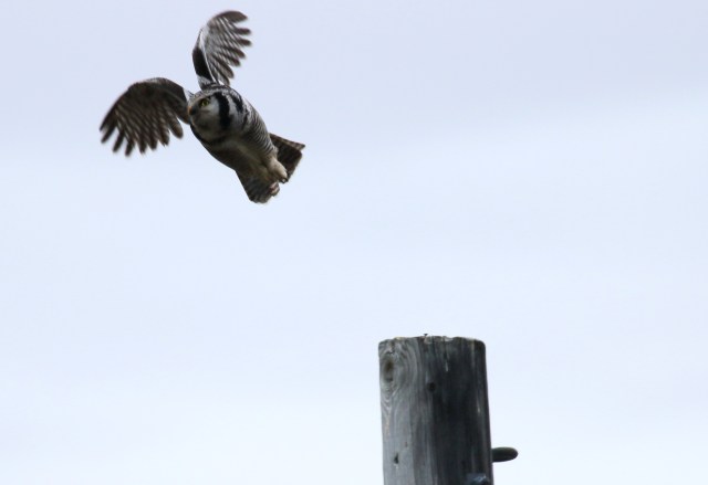 Slik startet en fin fotoseanse med haukugle – der 2 ugler viste seg samtidig, flyvende til og fra, en gang sittende 5 meter fra hverandre i hver sin stolpetopp.