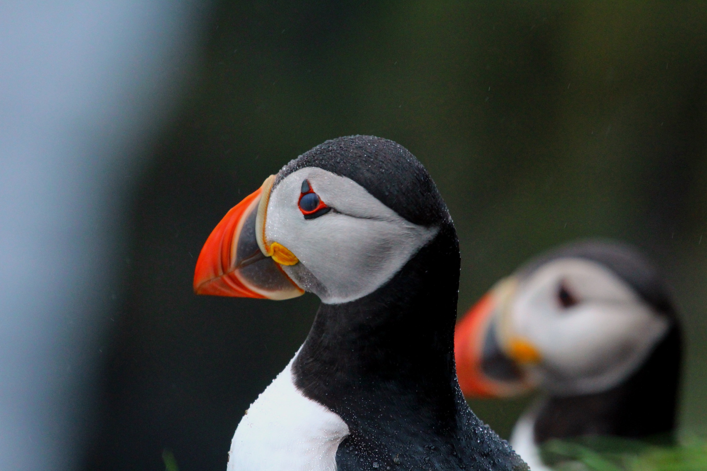 FOGGY DEW – like pearls tiny drops of mist cover the plumage of the Puffin, photographed on a foggy day amidst hundreds of the kind on the steep green slopes riddled with nest burrows, adjacent to the huge cliffs towering from the Atlantic on the westernmost point of Mykines Island in the Faroe Archipelago.
