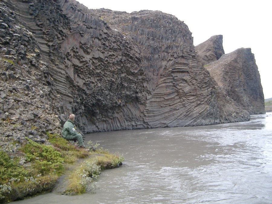 parti fra Hljódaklettar: basaltlava størknet i sekskantede søyler i ulke retninger