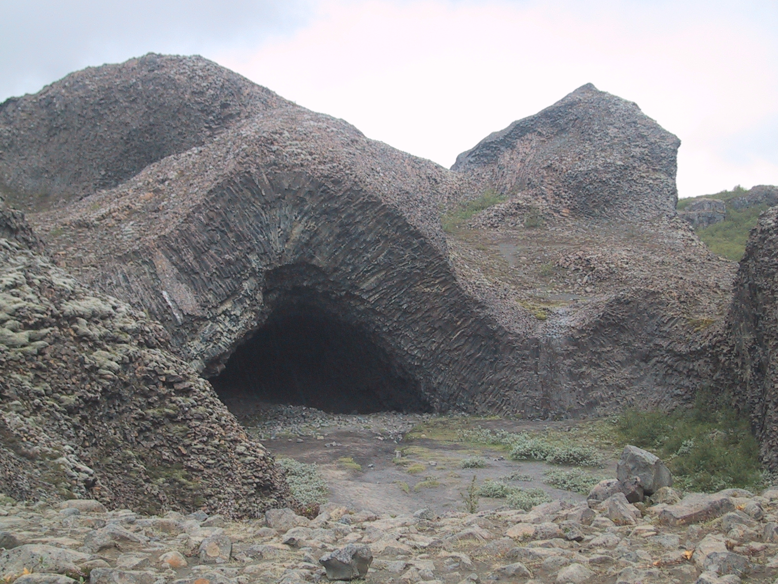 parti fra Hljódaklettar: Kyrkan, i basaltlava størknet i sekskantede søyler i ulke retninger