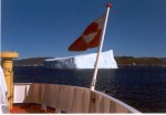 - det grönlandske flagget – i bakgrunnen et grunnstøtt isfjell ved Qaqortoq