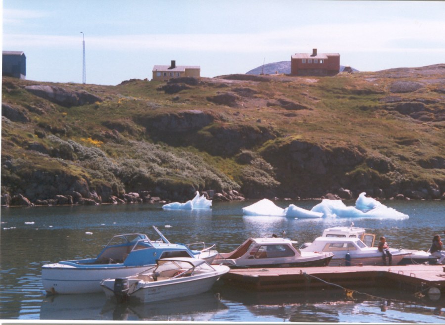 Narsaq: småbåthavnen i juli med rester av isfjell