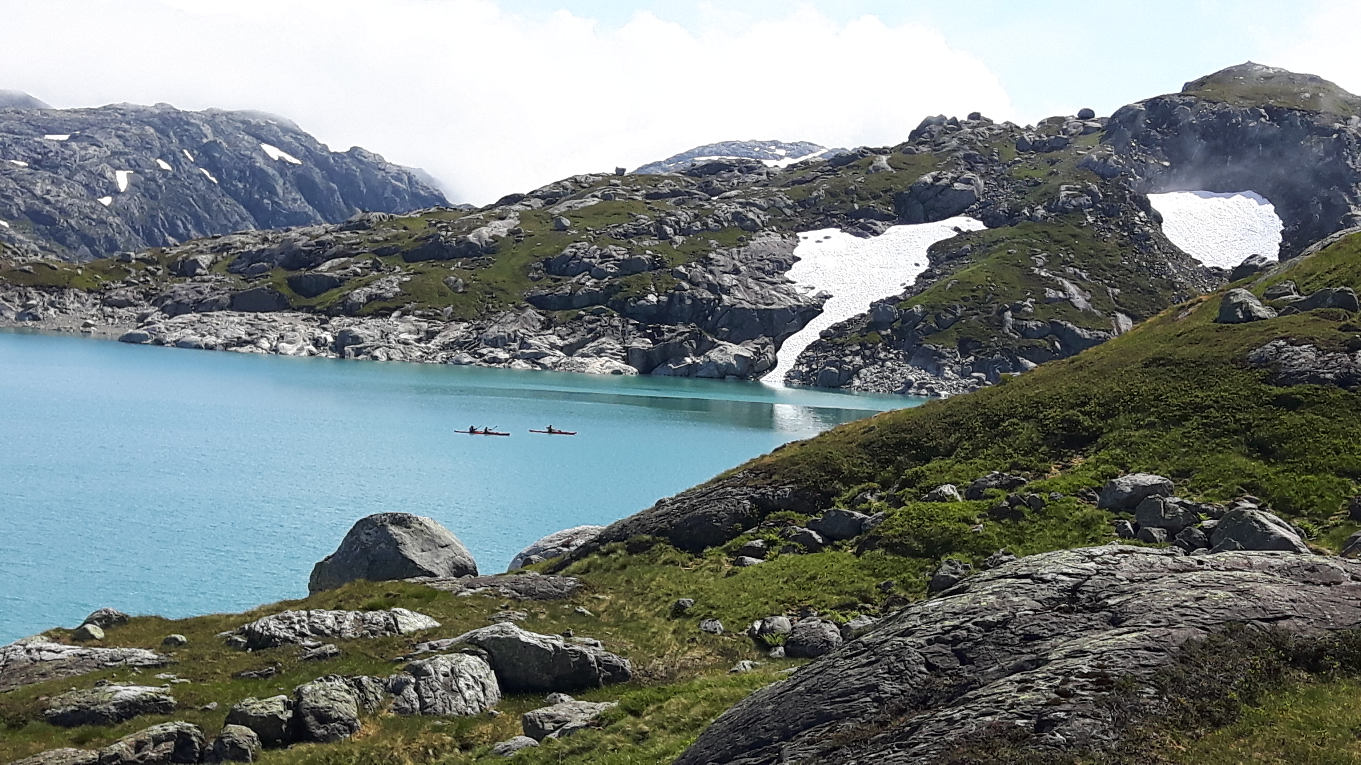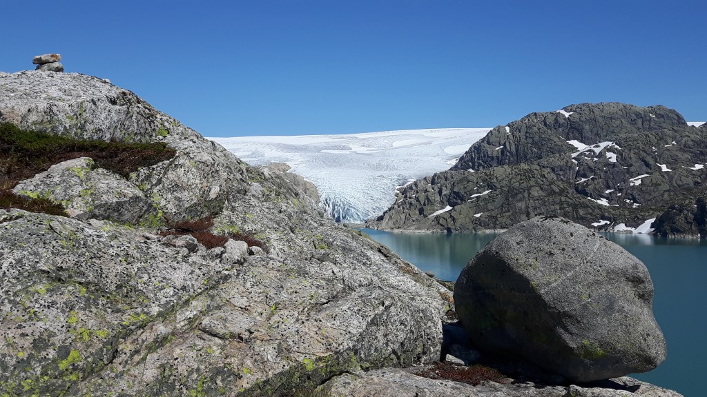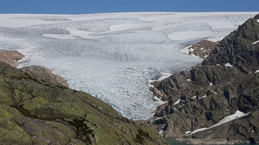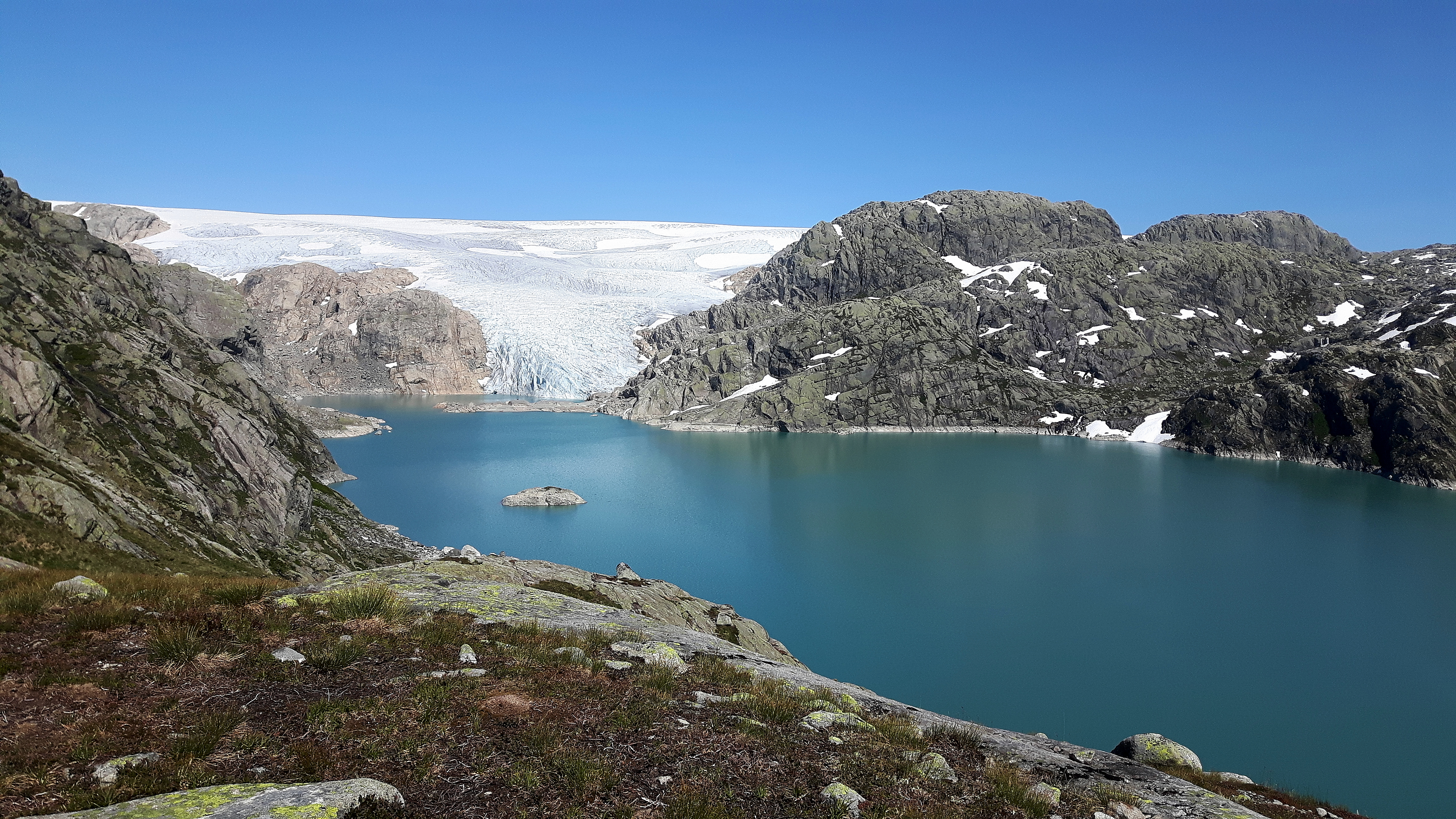 Bilder fra et par turer langs Insta Møsevatnet, på vestsiden i retning nordenden av vatnet. Her strekker Folgefonna seg like ned i vannet, og tidvis kalver brefronten der.