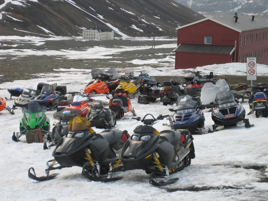 scooterparkering øverst i Longyeardalen – ’Huset’ i bakgrunnen