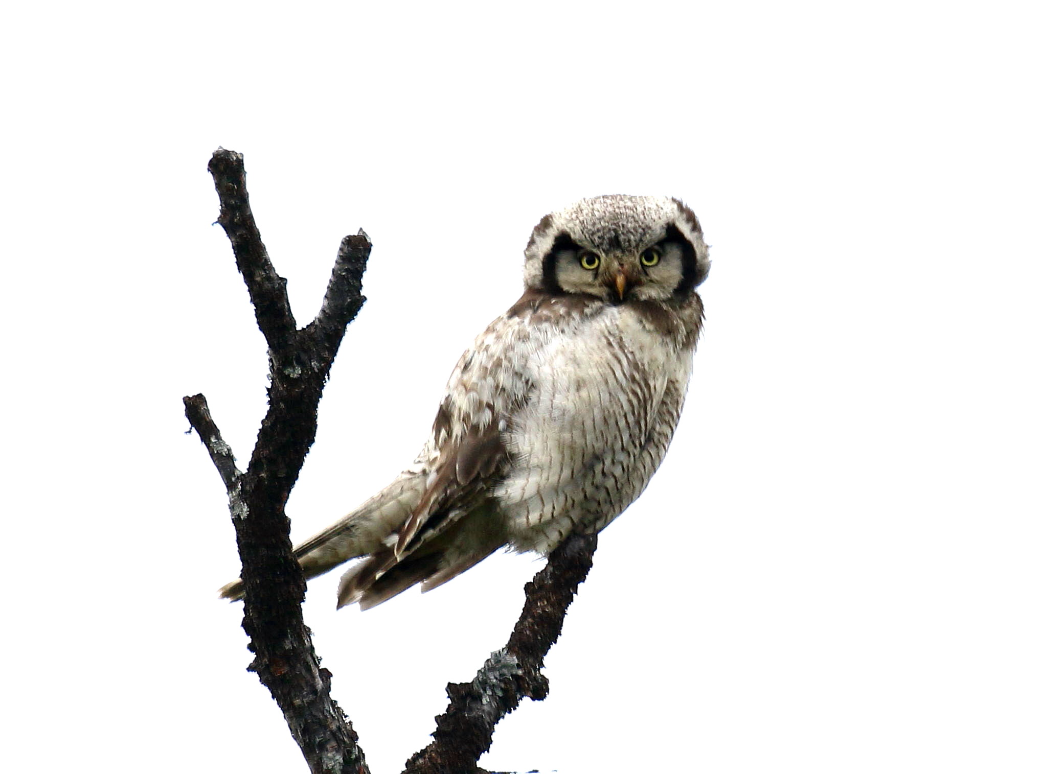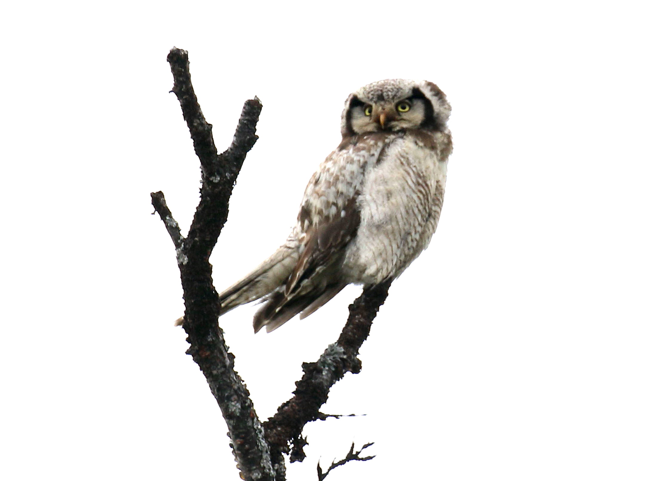 går nærmere – og der i treet et stykke foran oss sitter den, og skriker – en haukugle !