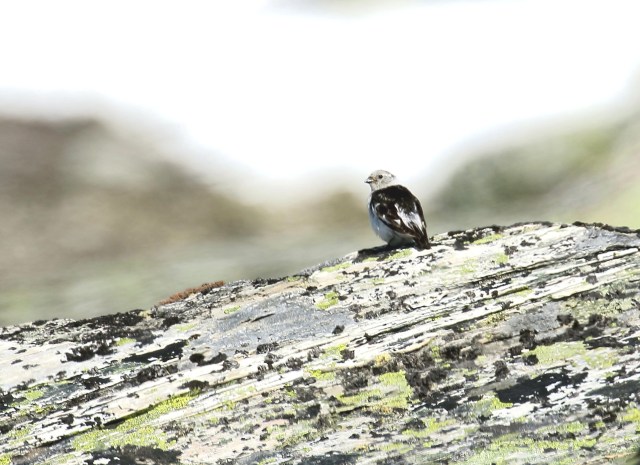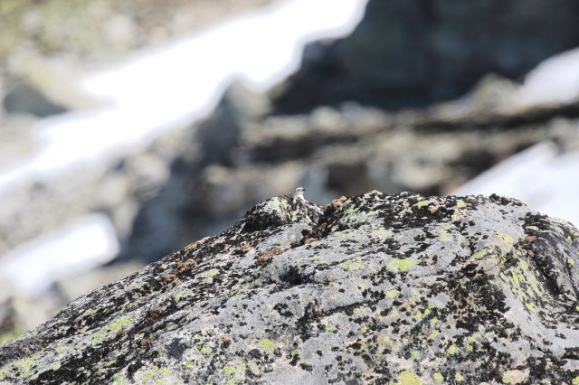 Snøspurv i sitt rette element – mellom snøfenner og steinblokker, ca. 1.400 m.o.h.