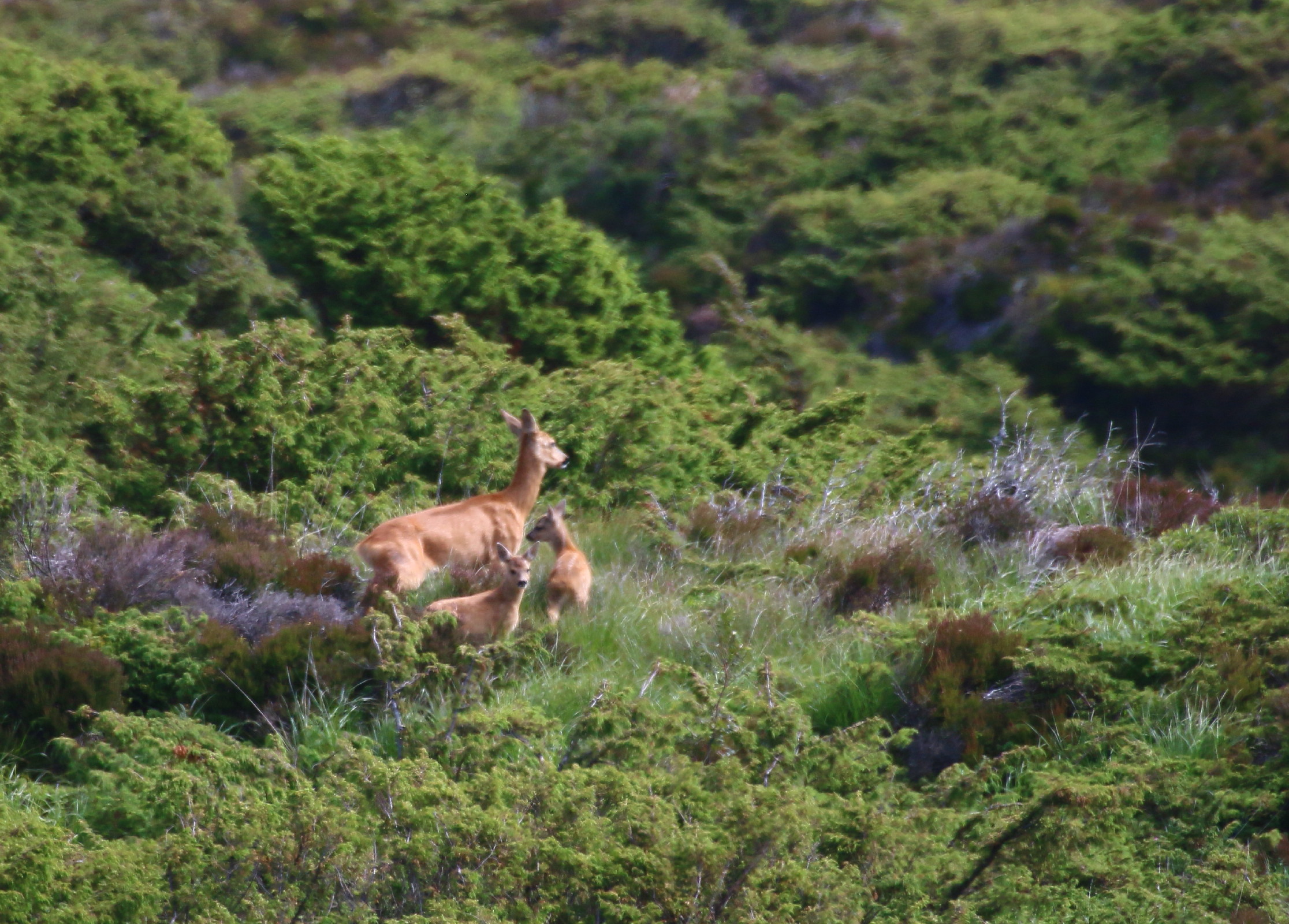 Dette første bildet er tatt på kanskje en kilometers avstand, etter at min turkompis hadde spottet dem gjennom 600 mm’en sin. Godt gjort ! Bildet viser omtrent hva vi så med øyet, to små prikker, midt på myra nærmest skogkanten (brennvidde 100 mm, ucroppet)